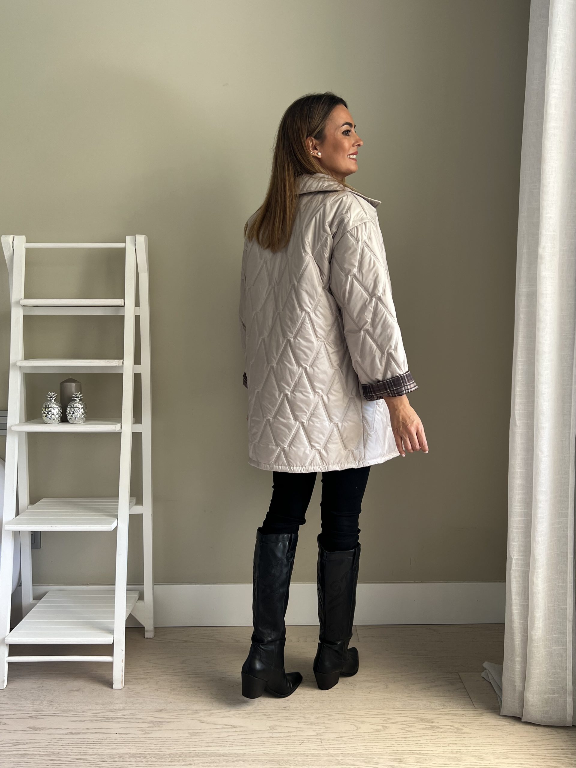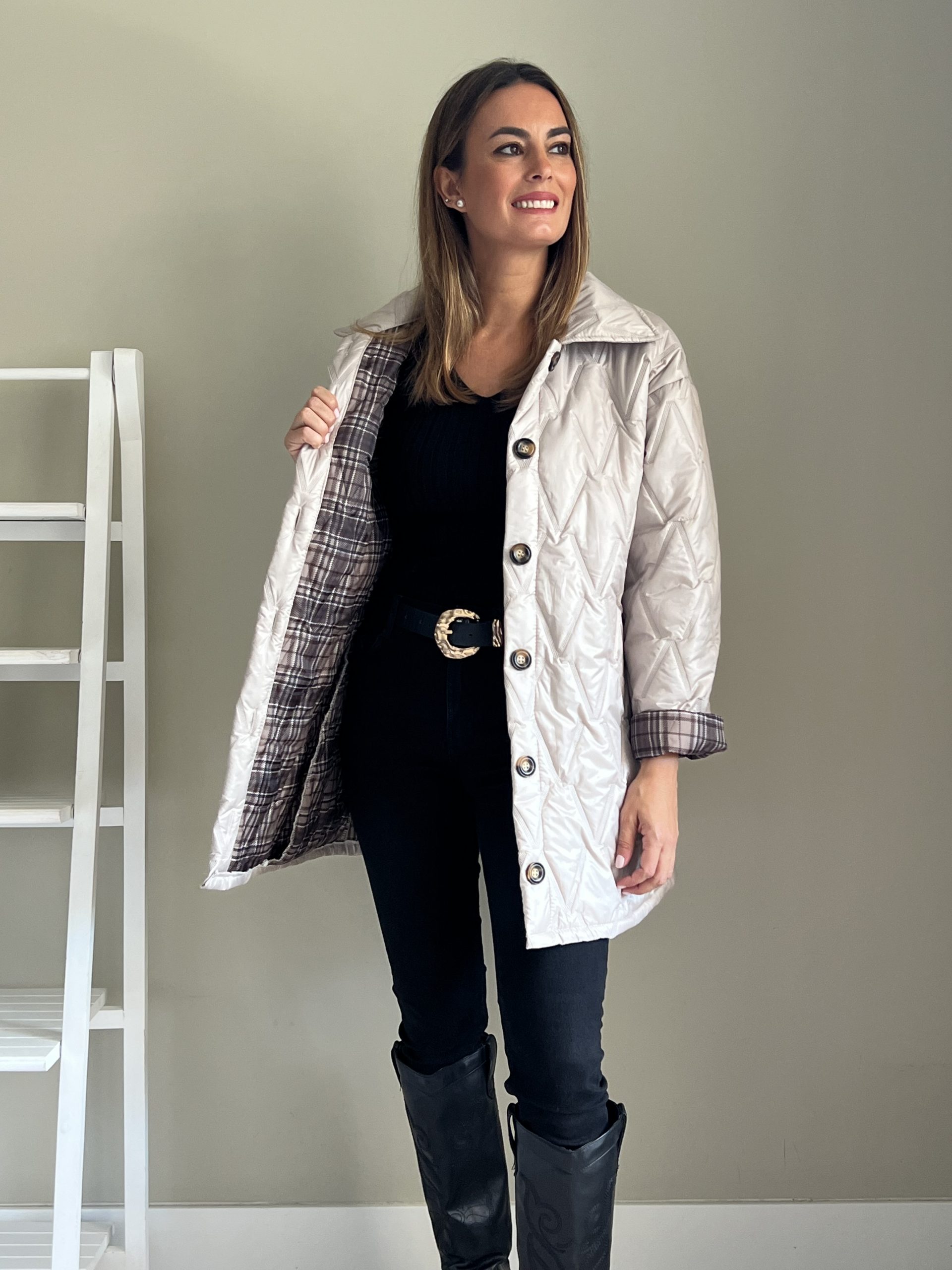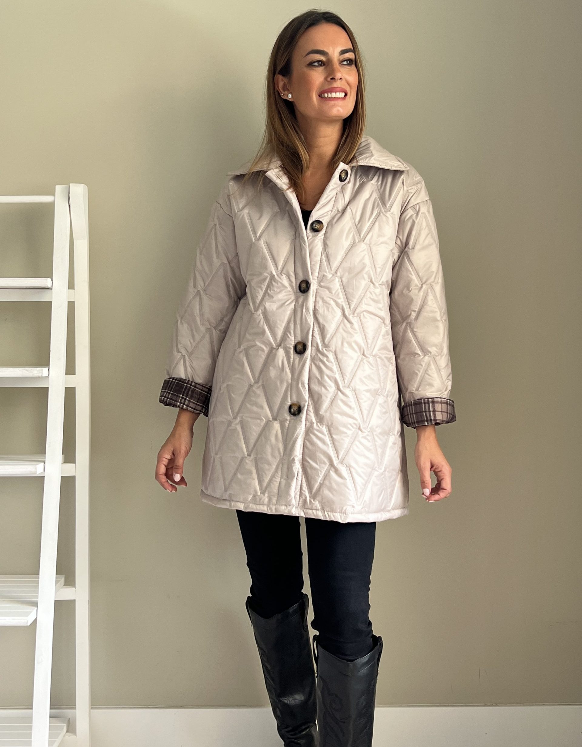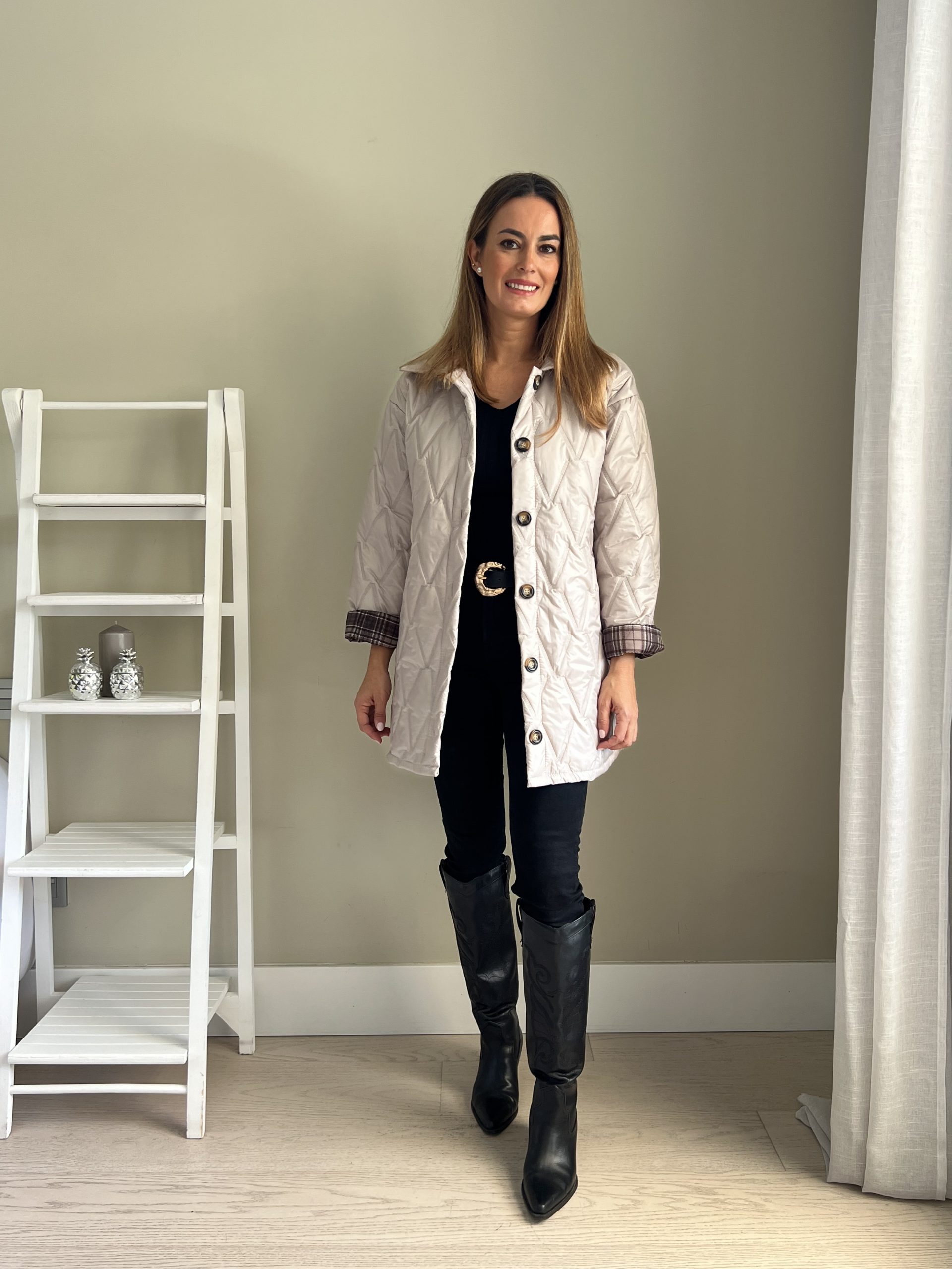 Abrigo acolchado con tejido chubasquero de color beige. Cierre con botonadura marrón. Bolsillos laterales. Forro de cuadros marrón, nego y beige.