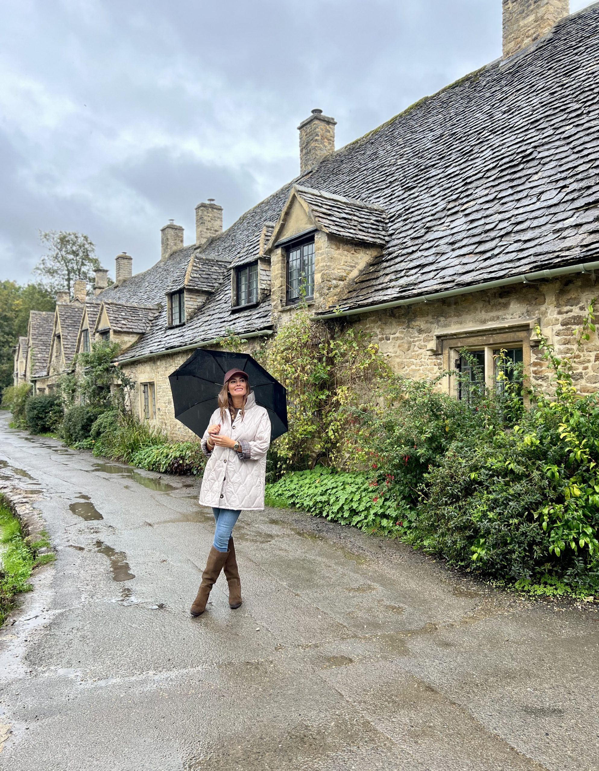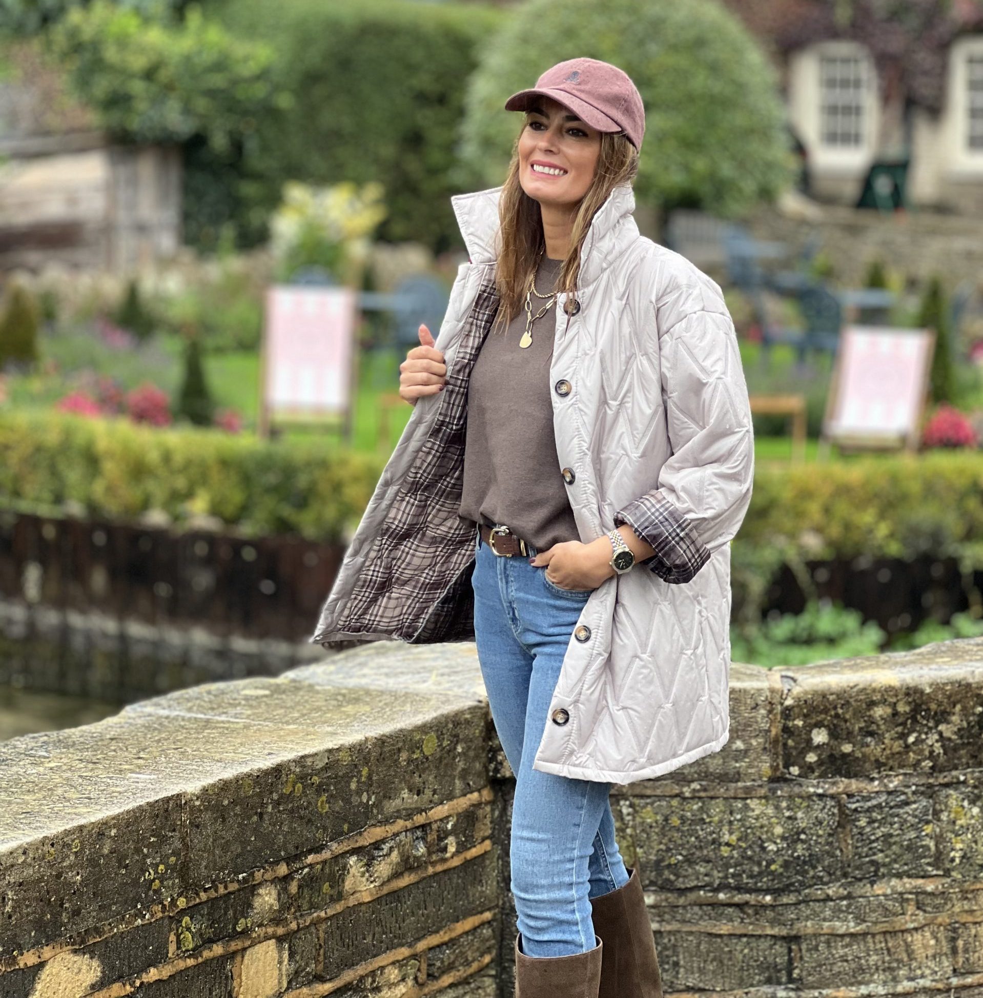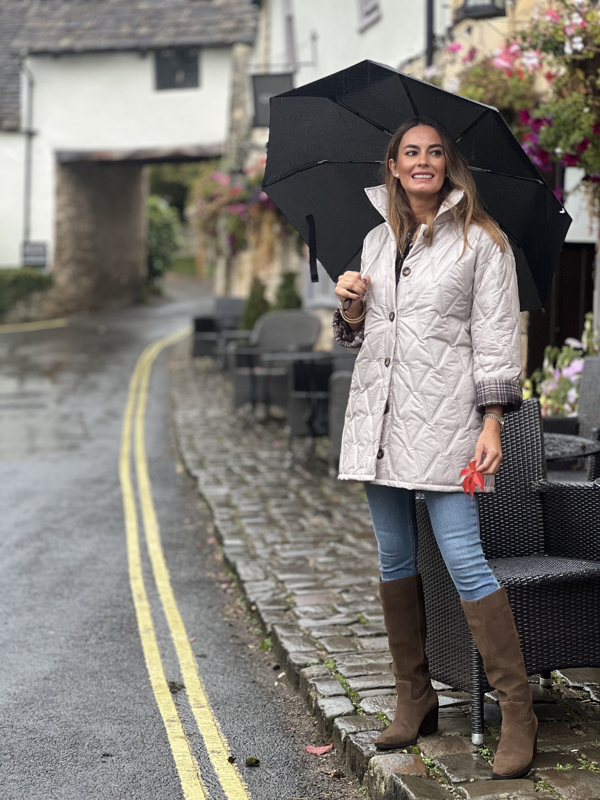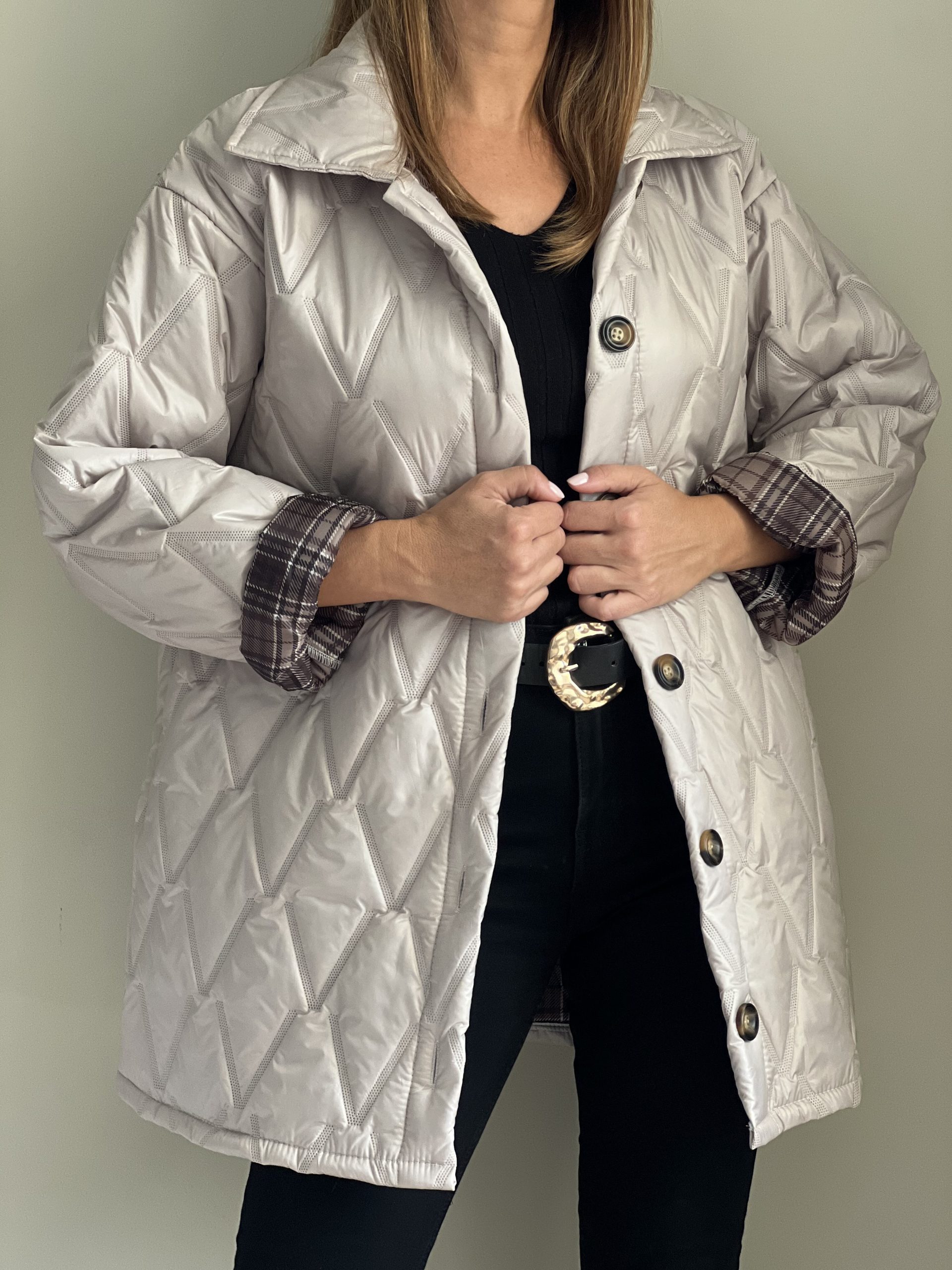 Abrigo acolchado con tejido chubasquero de color beige. Cierre con botonadura marrón. Bolsillos laterales. Forro de cuadros marrón, nego y beige.