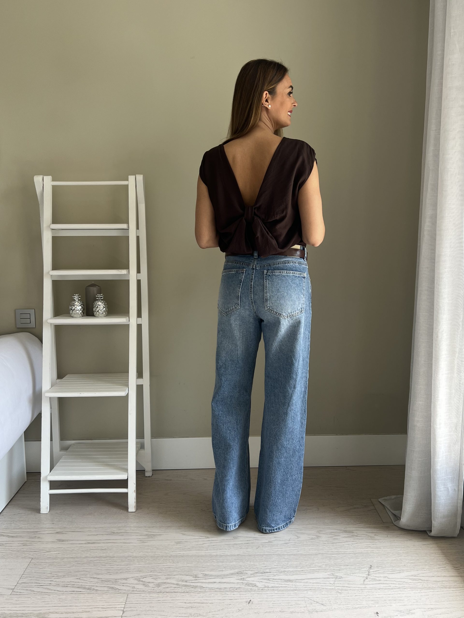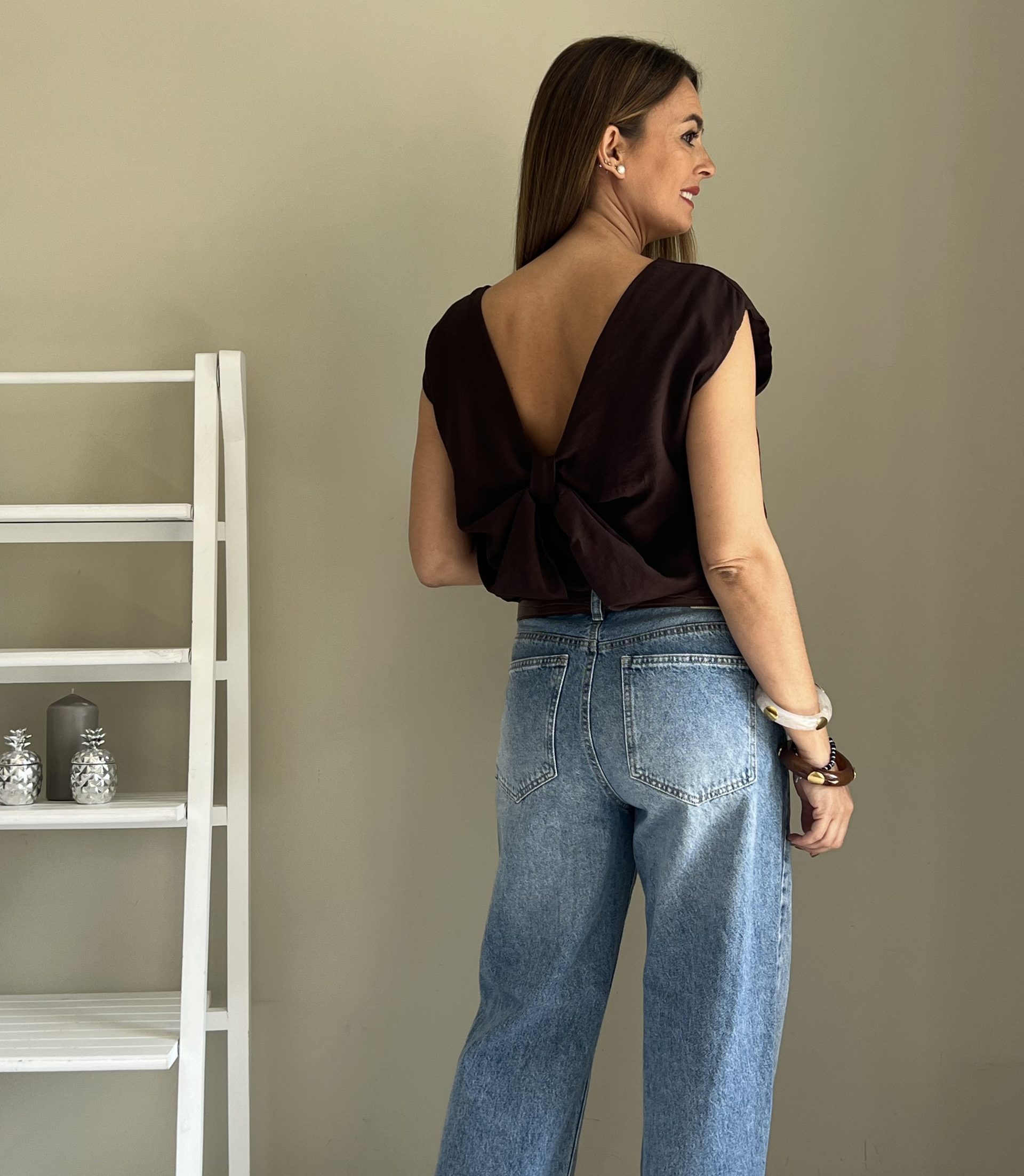 Blusa marrón chocolate de manga corta con detalle de lazada en la espalda.