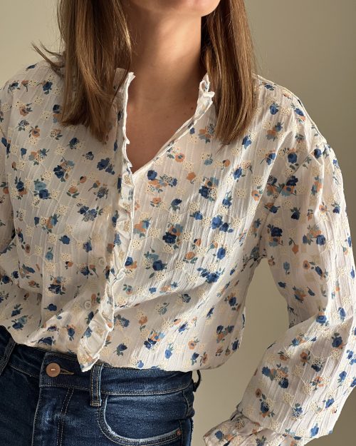 Camisa de flores bordadas en tonos azules y marrones. Fondo beige. Detalles de puntilla. Cuello mao. Puños con elástico.