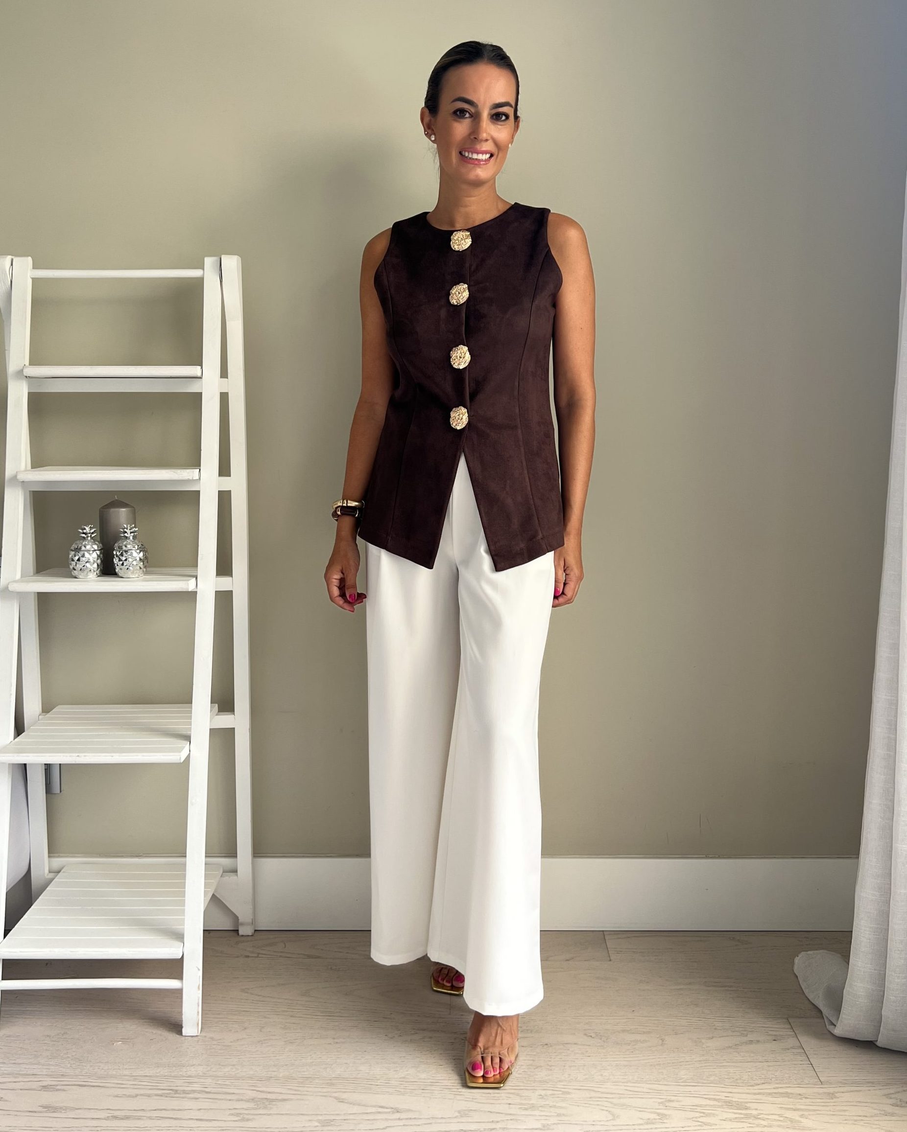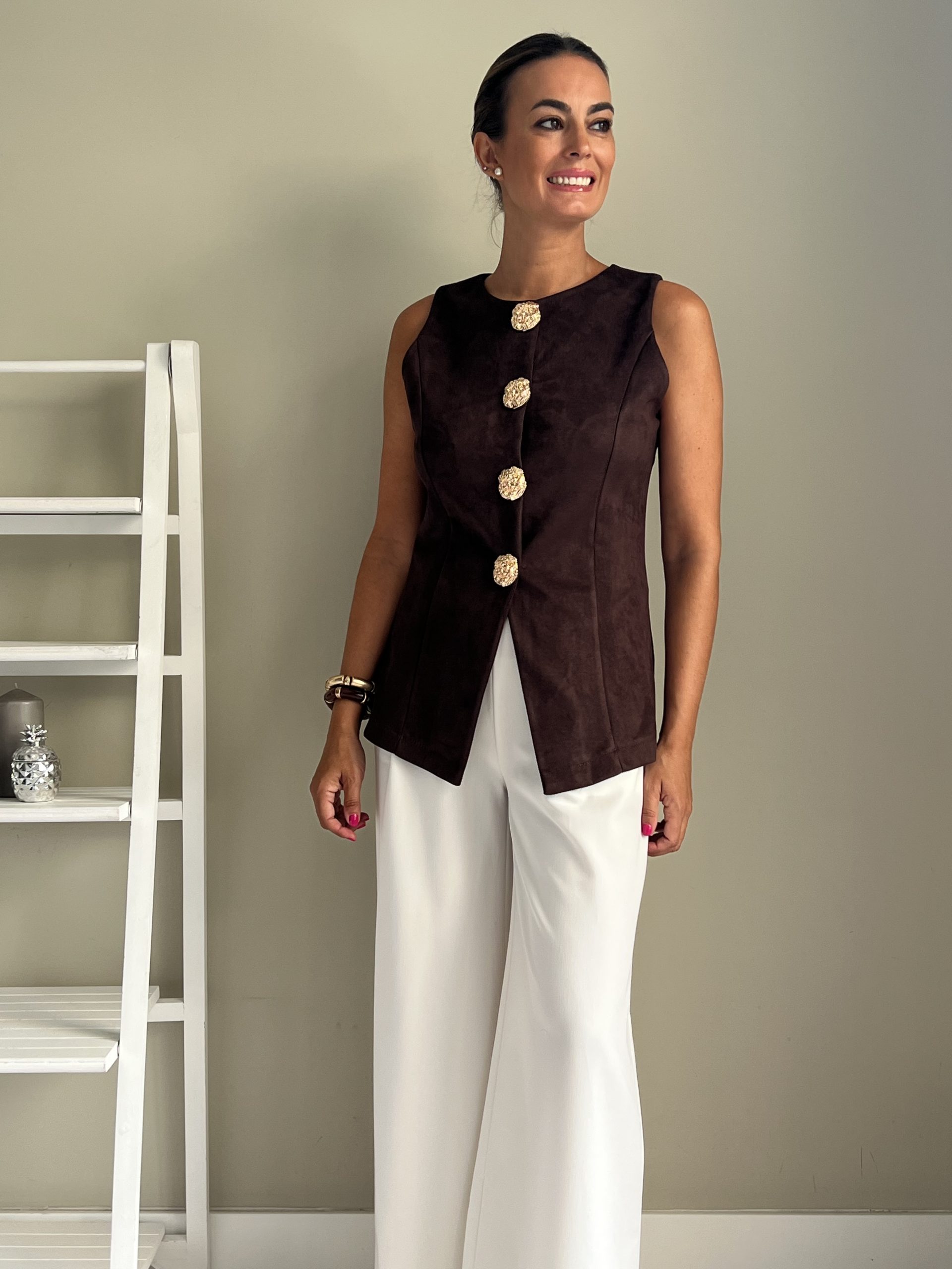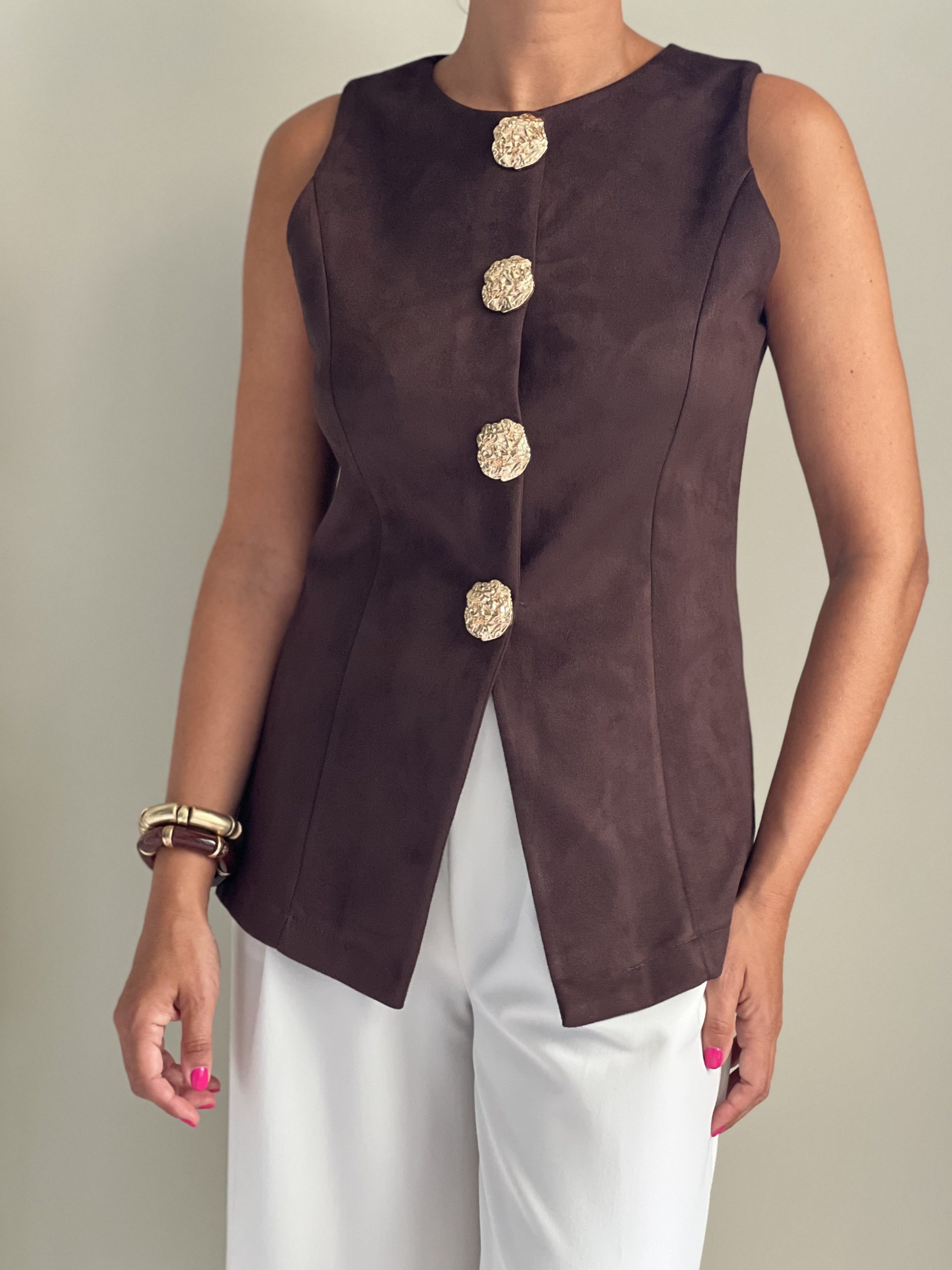 Chaleco de antelina color marrón chocolate con botones joya dorados. Botones invisibles de cierre por debajo. Abertura trasera.