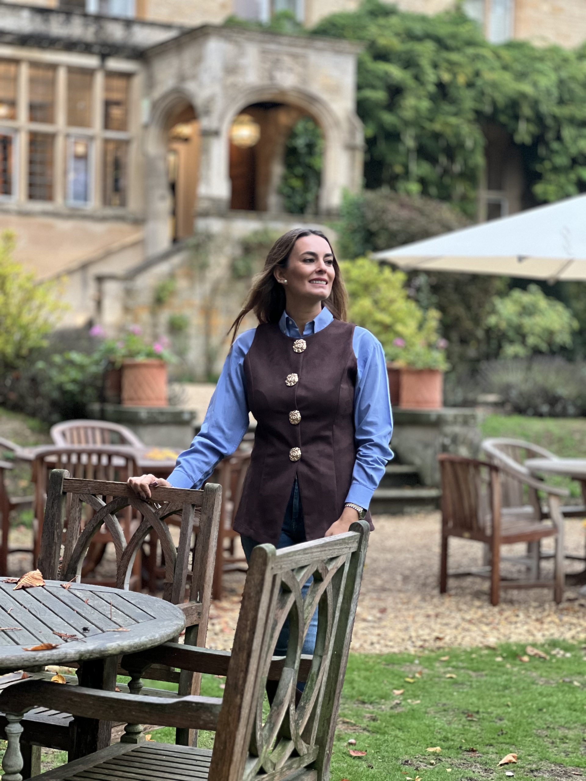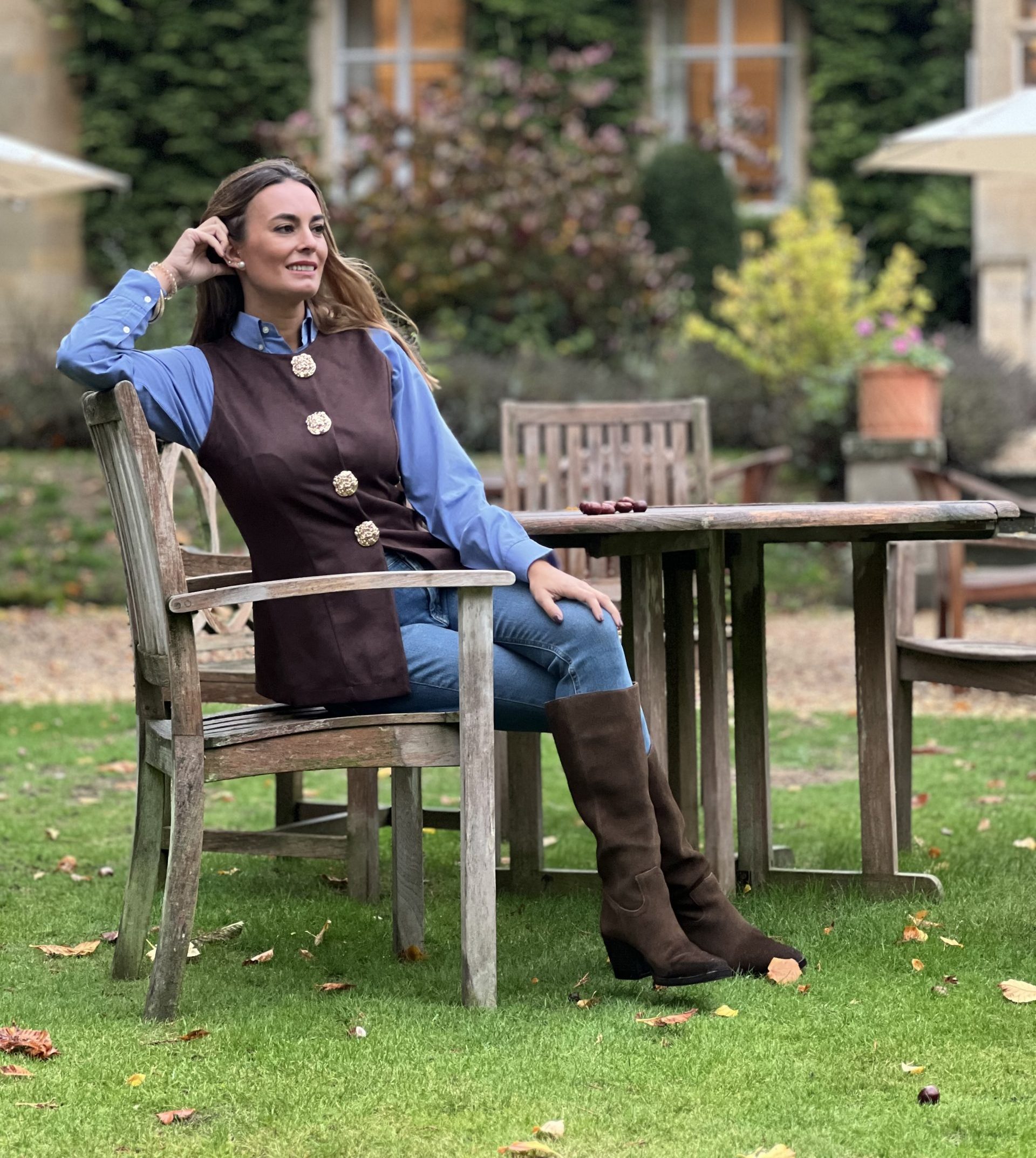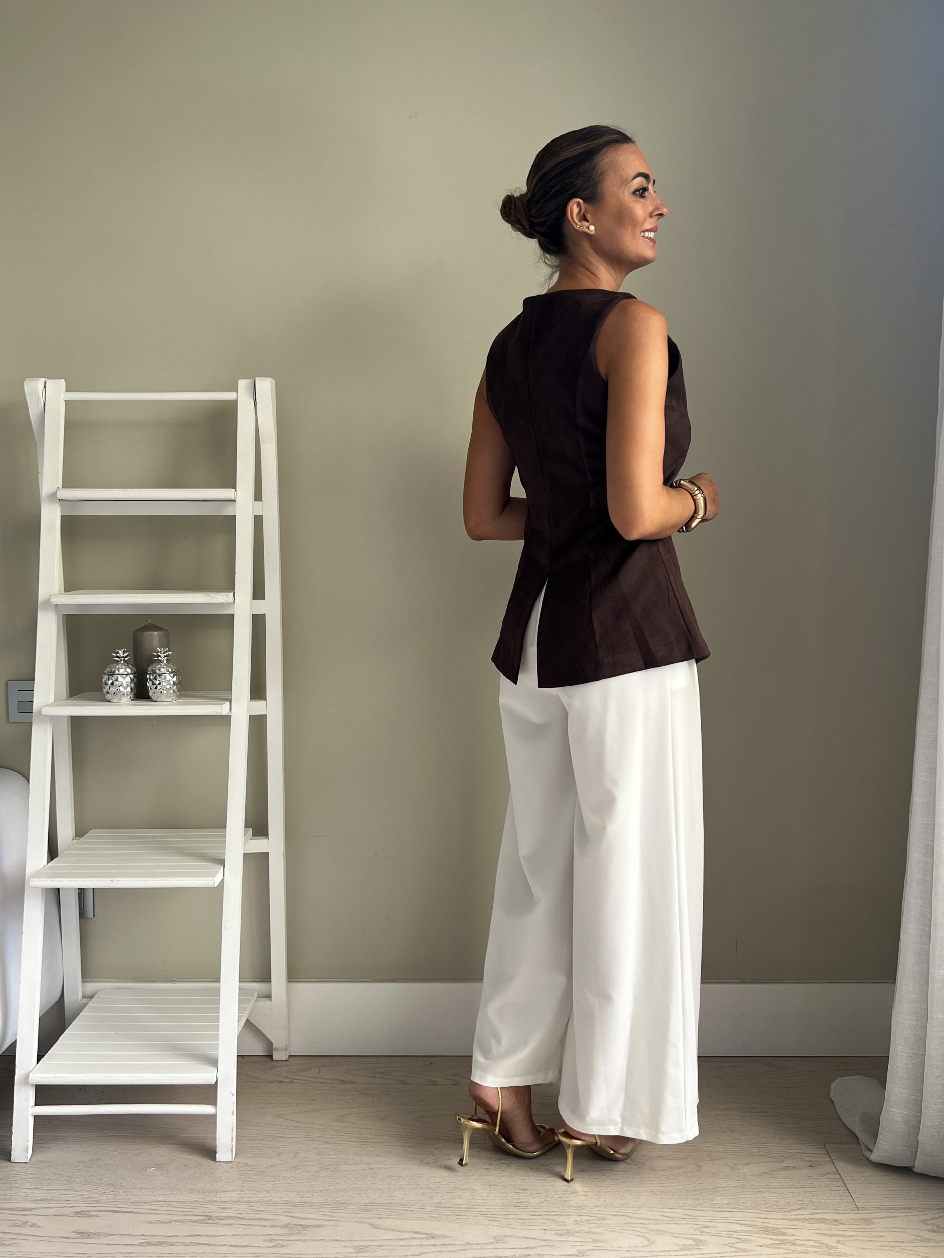 Chaleco de antelina color marrón chocolate con botones joya dorados. Botones invisibles de cierre por debajo. Abertura trasera.