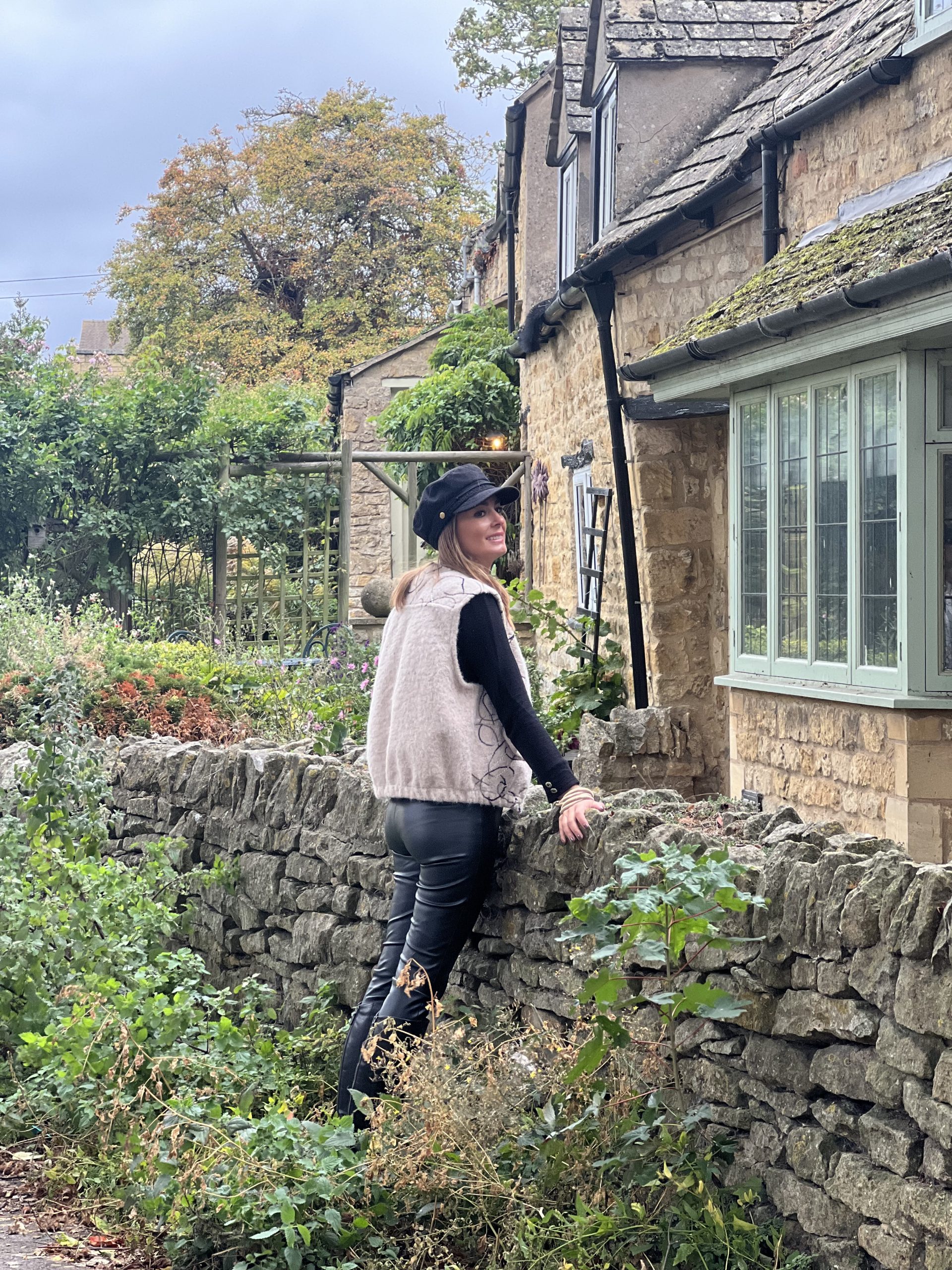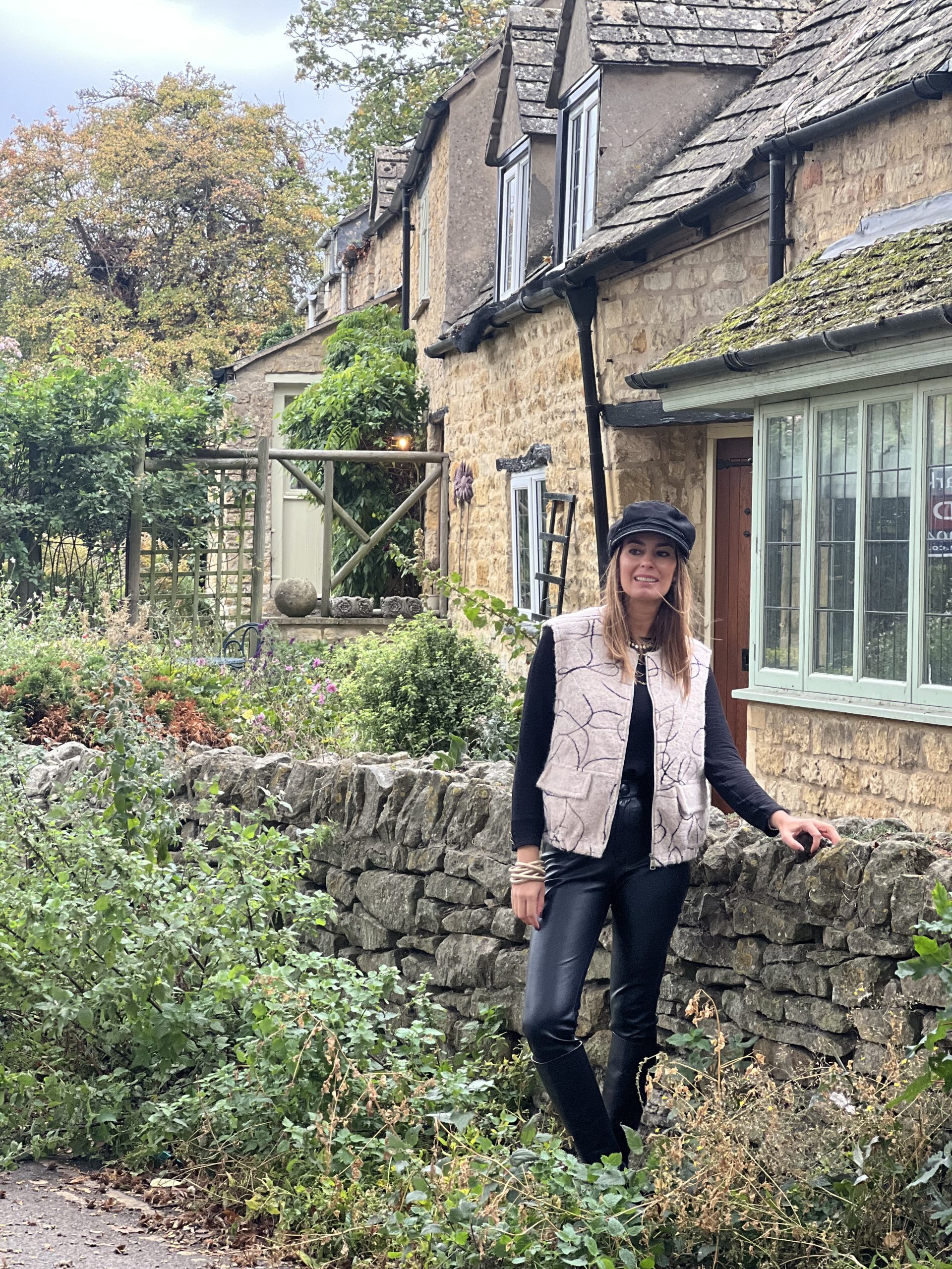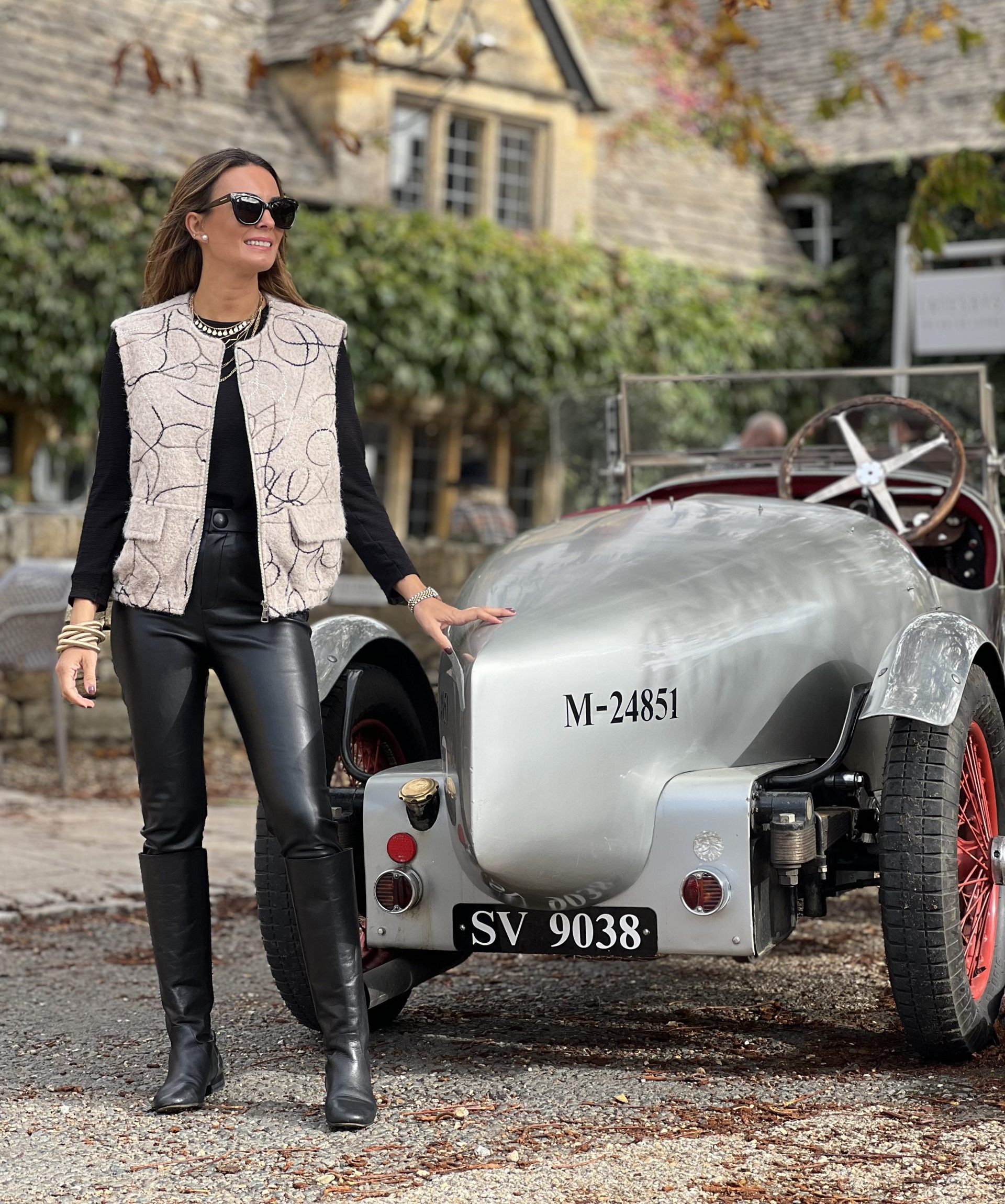 Chaleco de lanita de color beige con estampado negro y blanco. Cierre con cremallera plateada y falsos bolsillos laterales. Por la espalda es liso excepto en la parte de arriba.