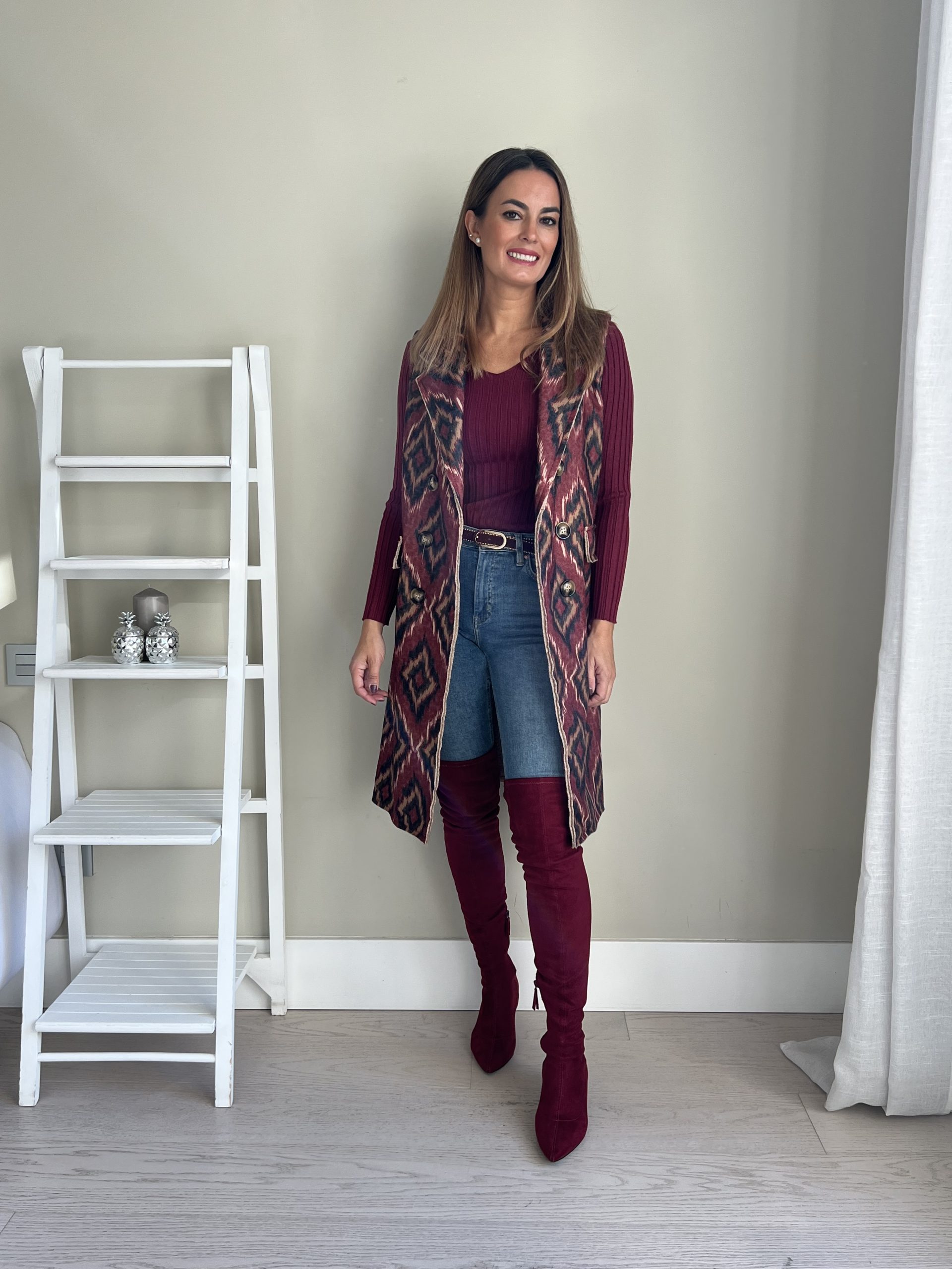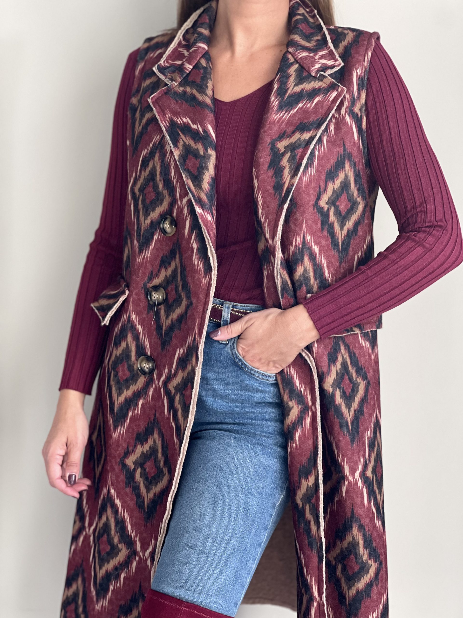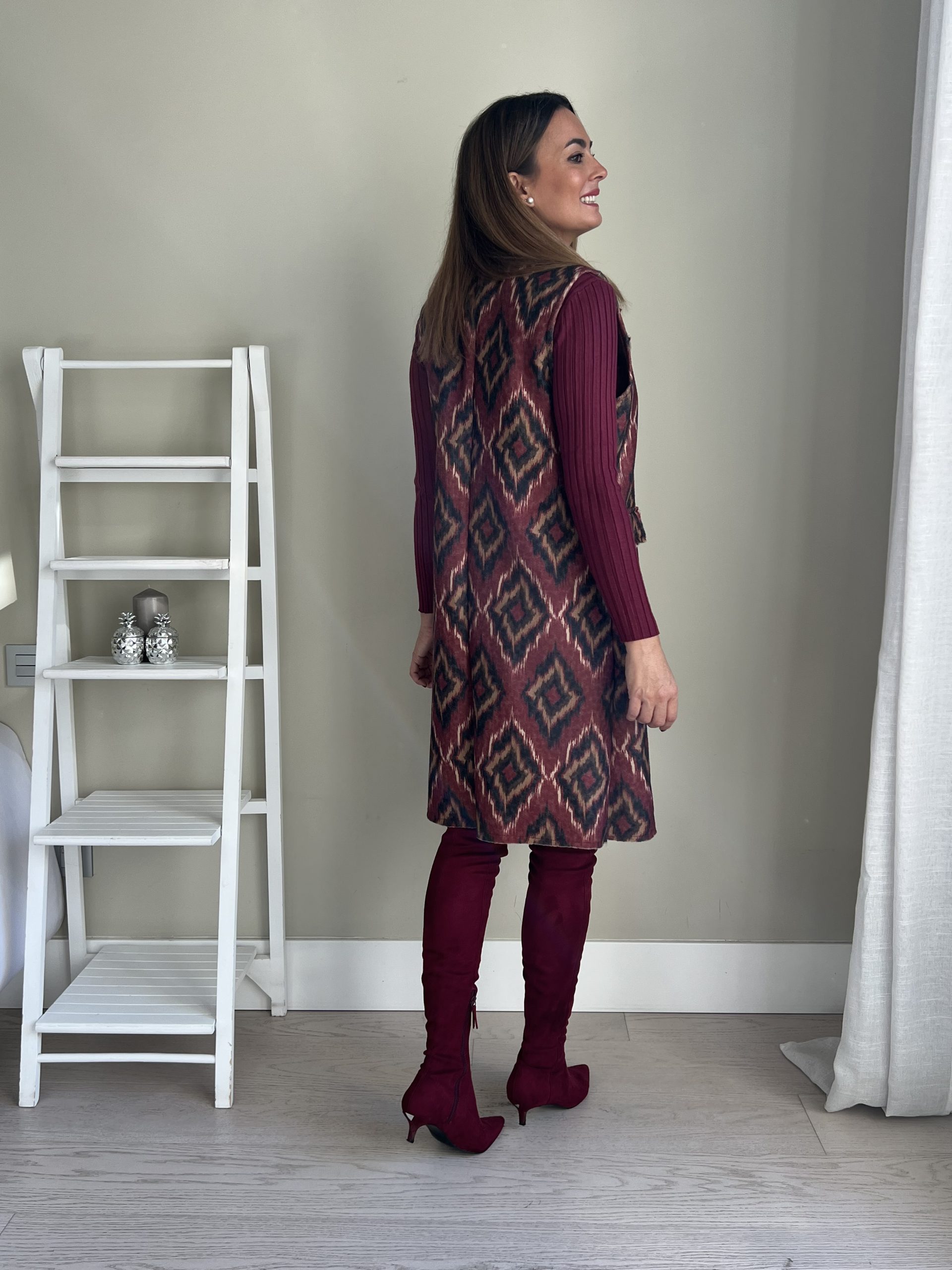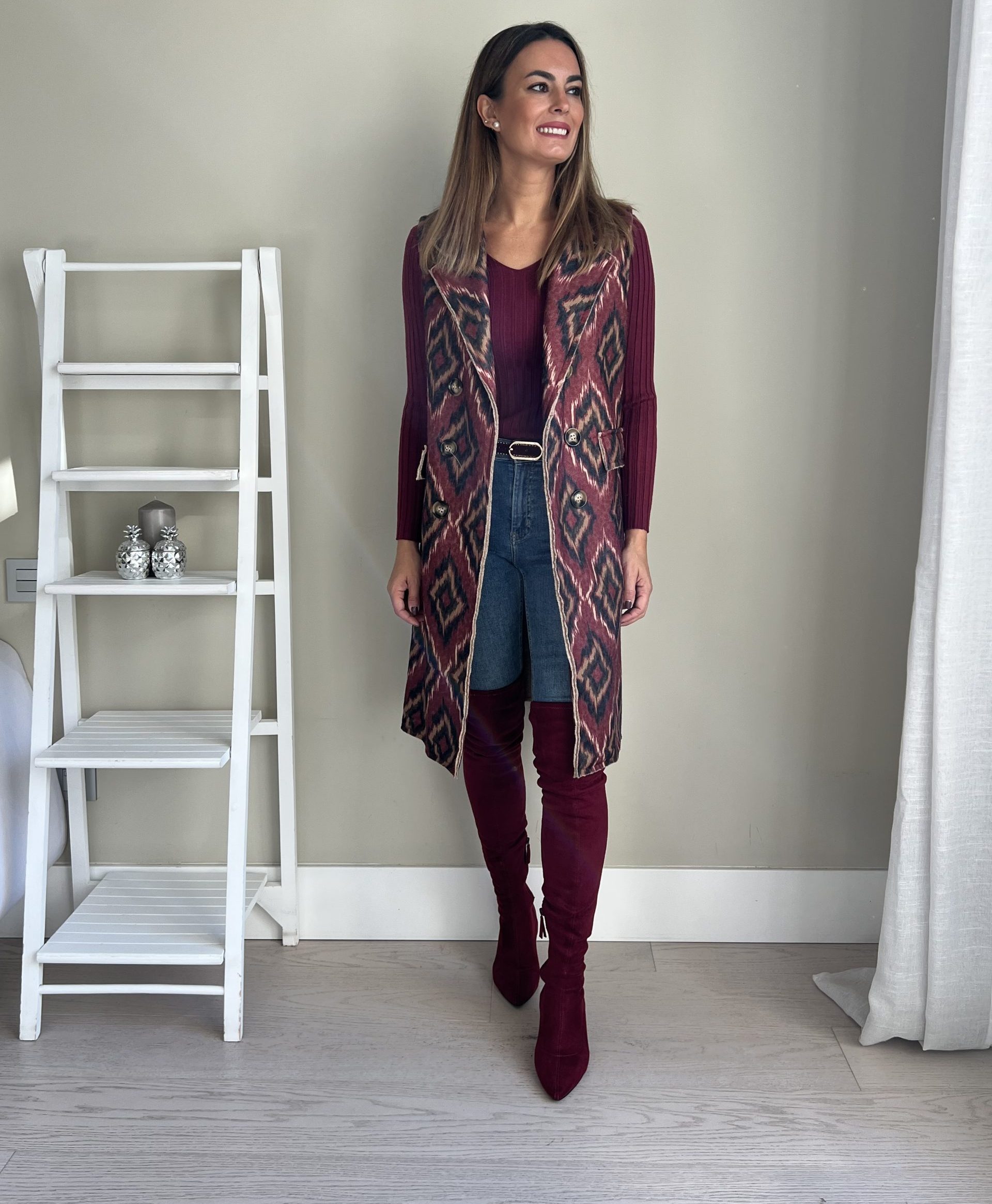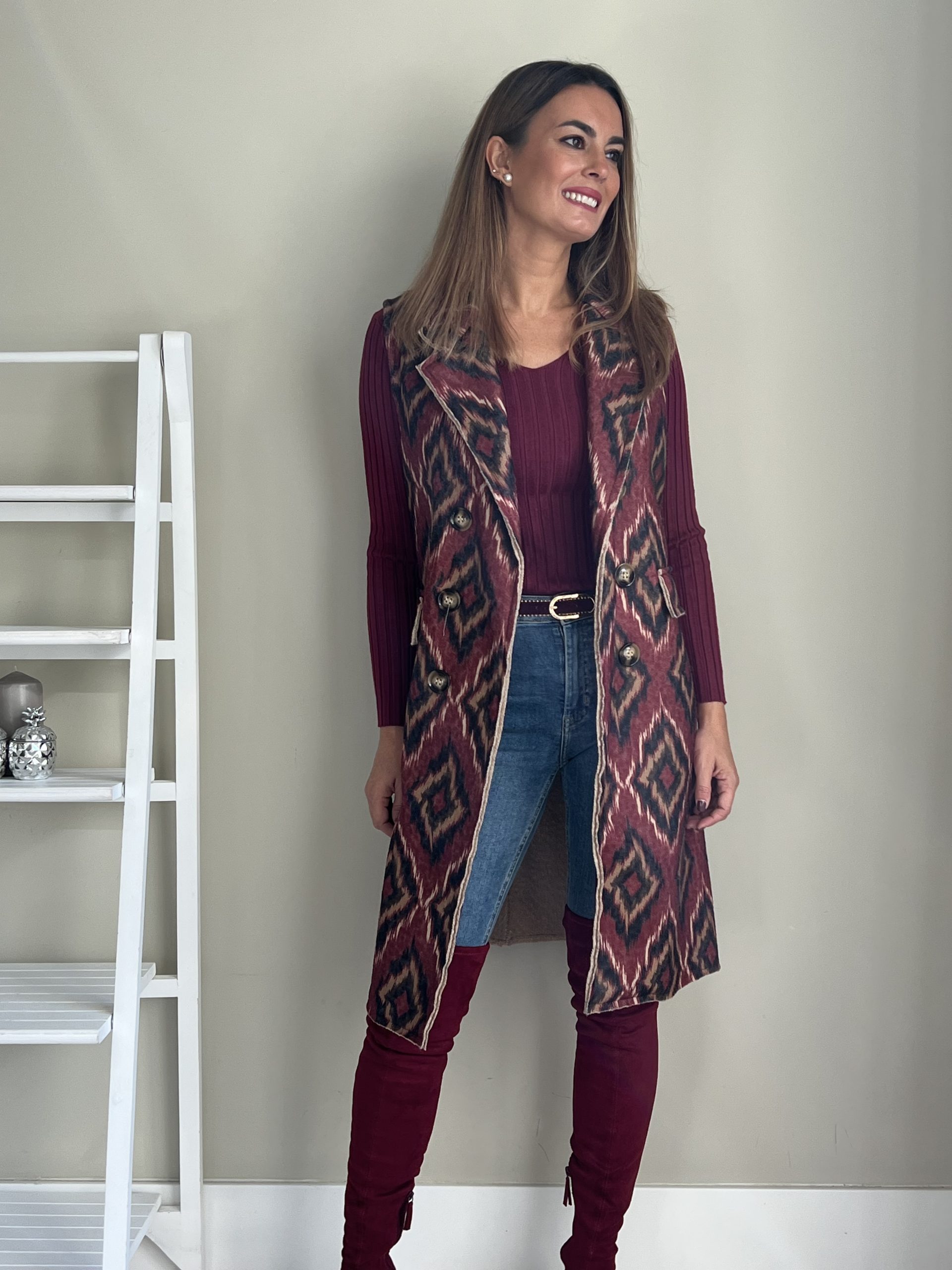 Chaleco largo de borreguito estampado en color granate, negro y camel. Falsos bolsillos laterales y botonadura de adorno. Interior de color beige.