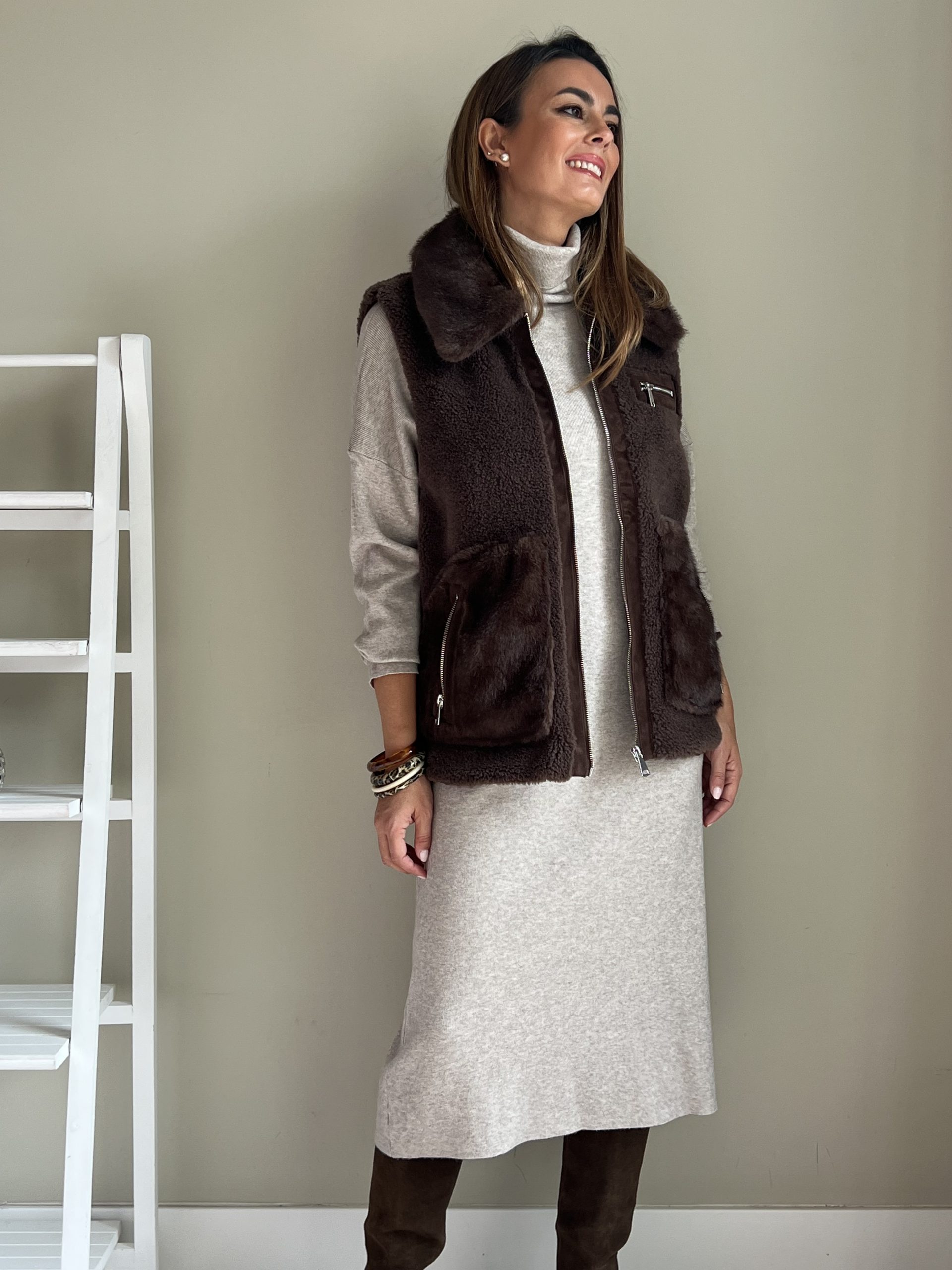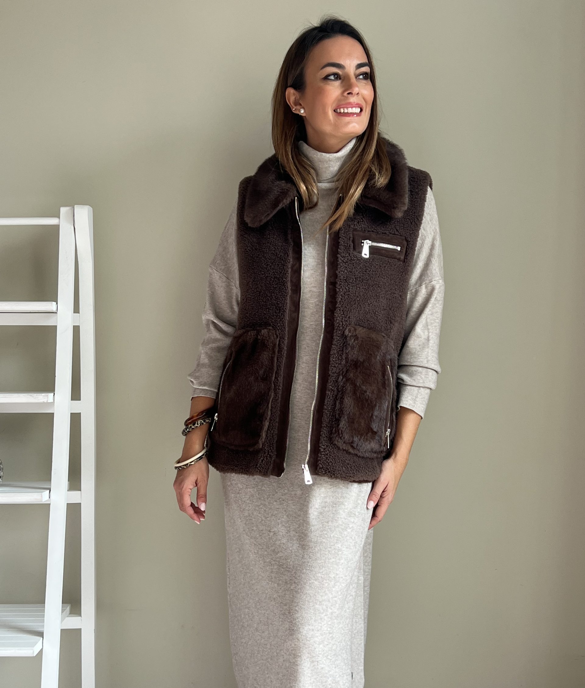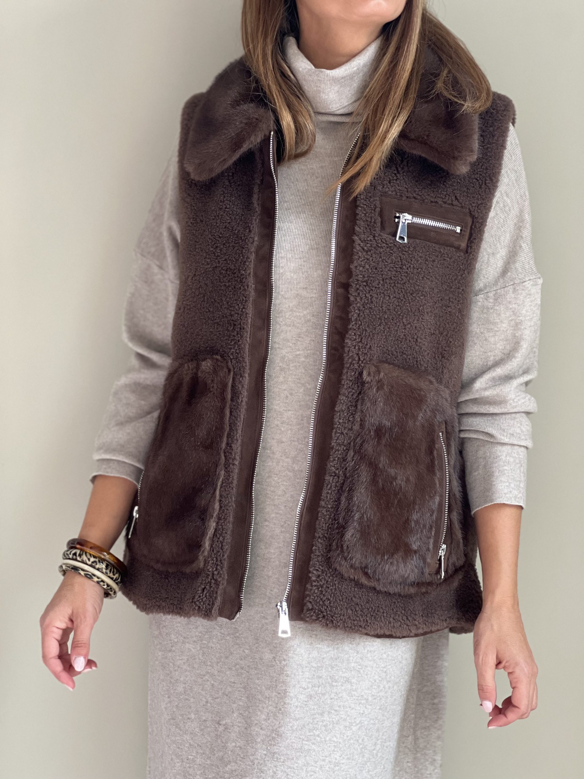 Chaleco combinado de pelo sintético y borreguito marrón chocolate. Bolsillos laterales con cierre de cremallera. Bolsillo pequeño en el pecho. Cierre con cremallera plateada.