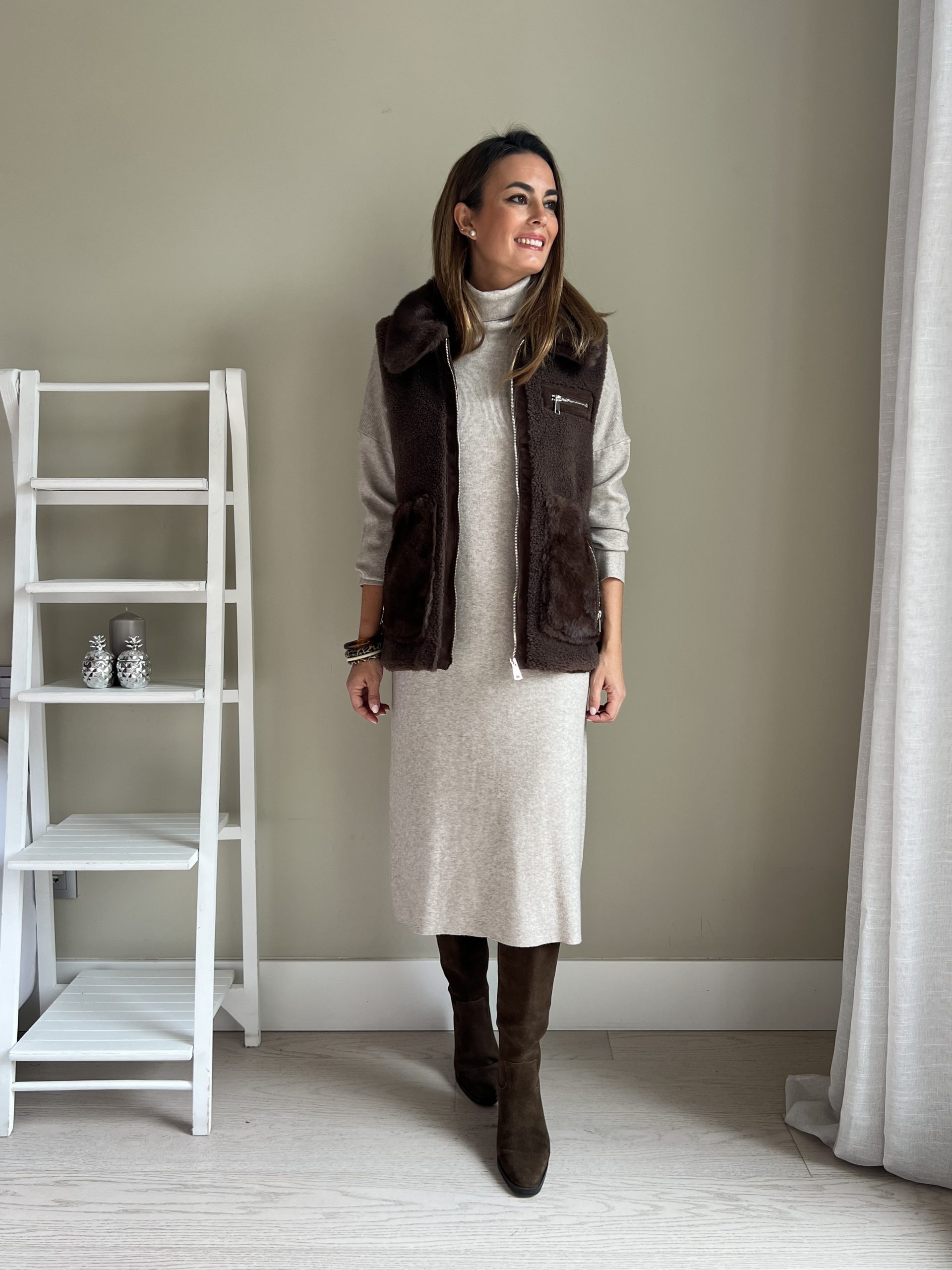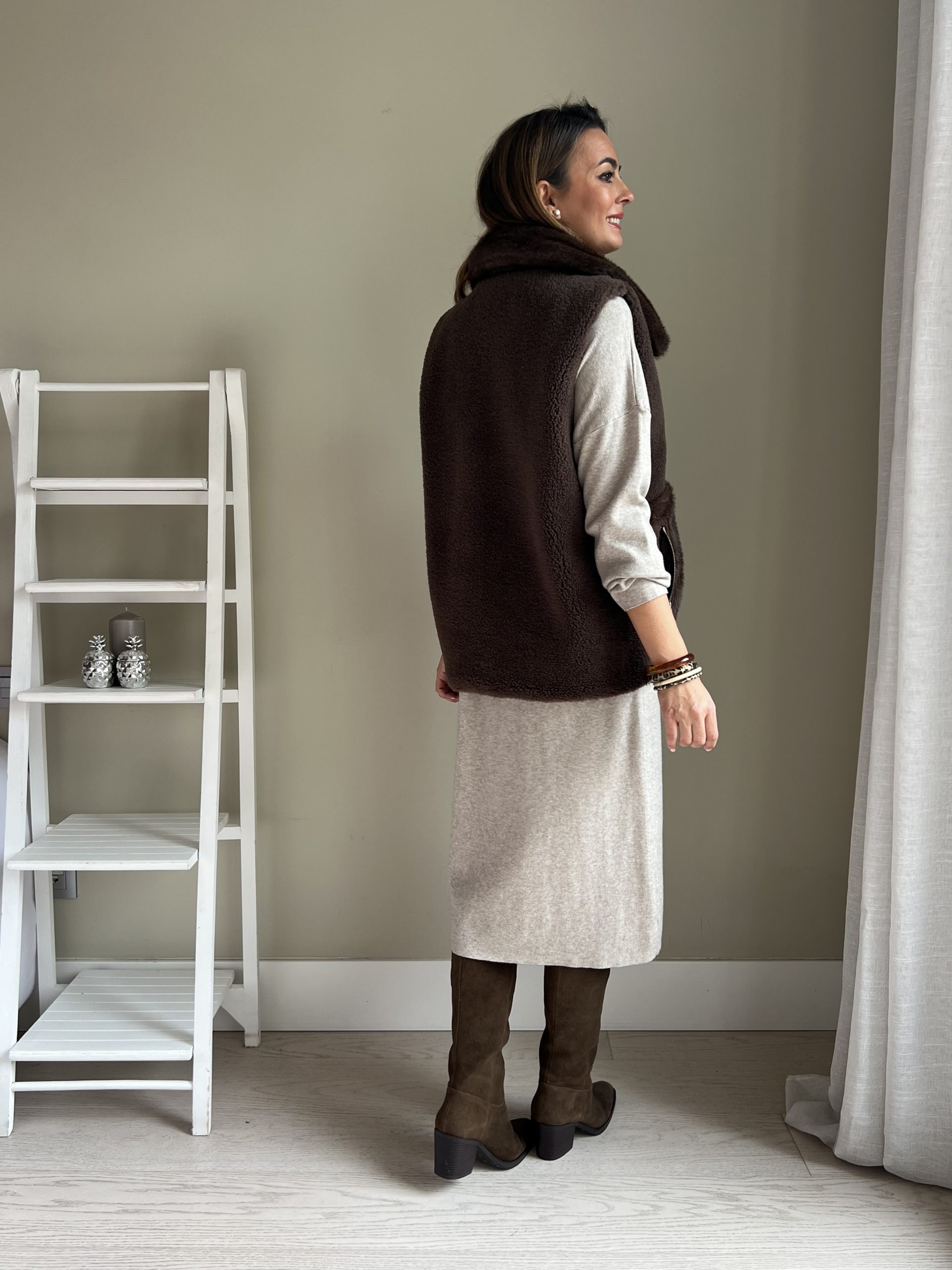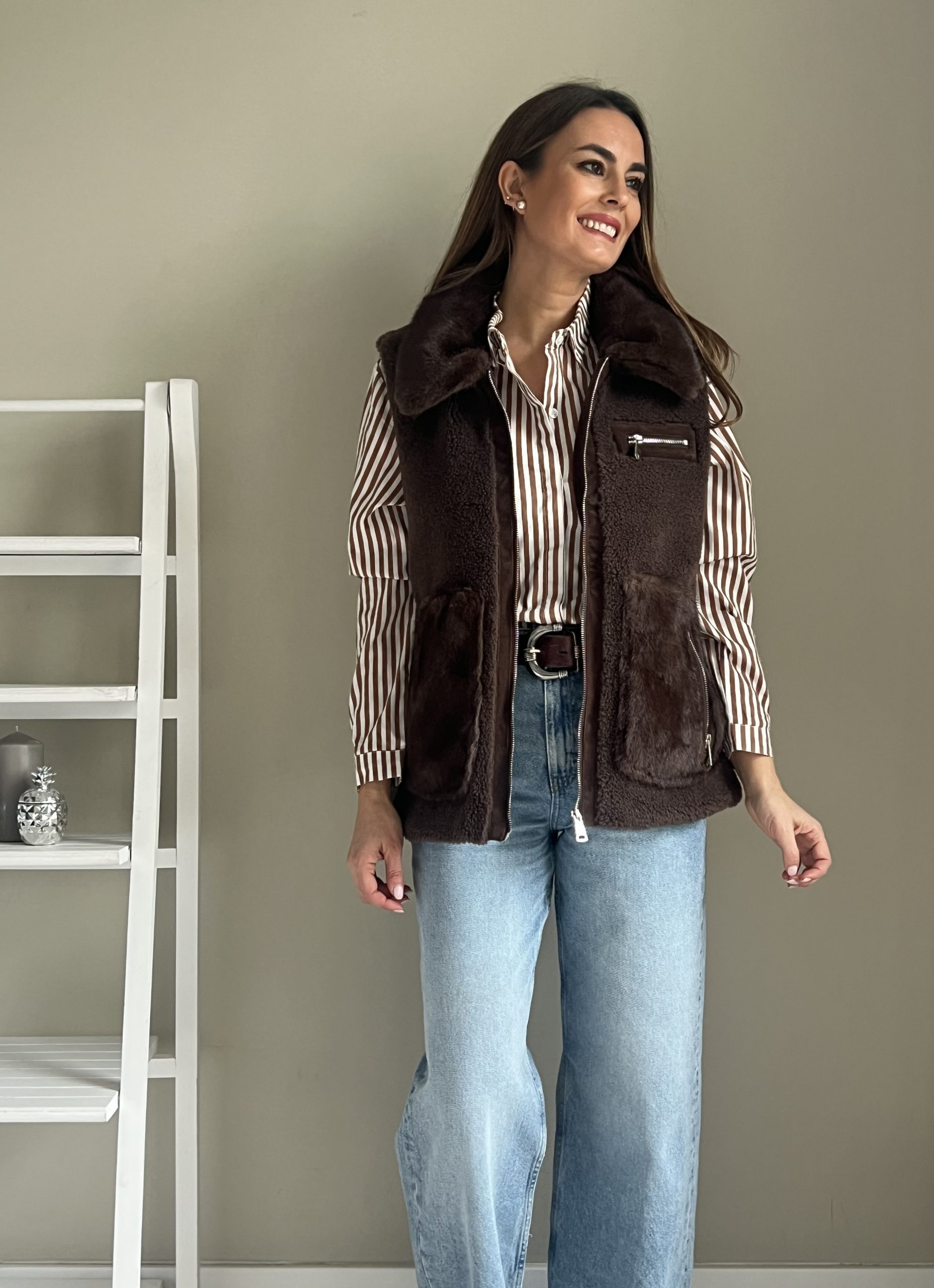 Chaleco combinado de pelo sintético y borreguito marrón chocolate. Bolsillos laterales con cierre de cremallera. Bolsillo pequeño en el pecho. Cierre con cremallera plateada.