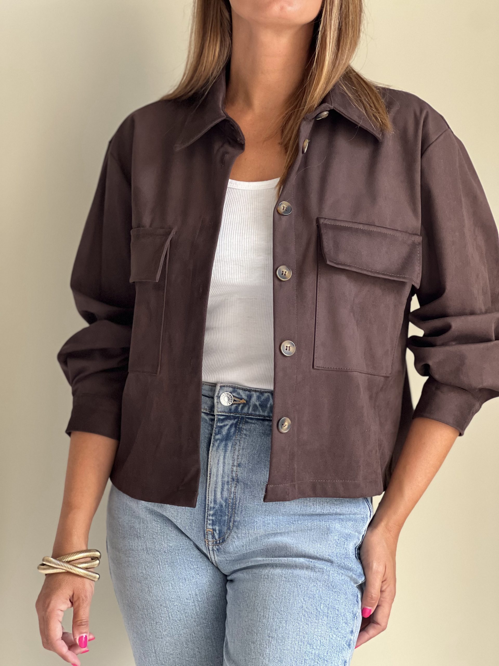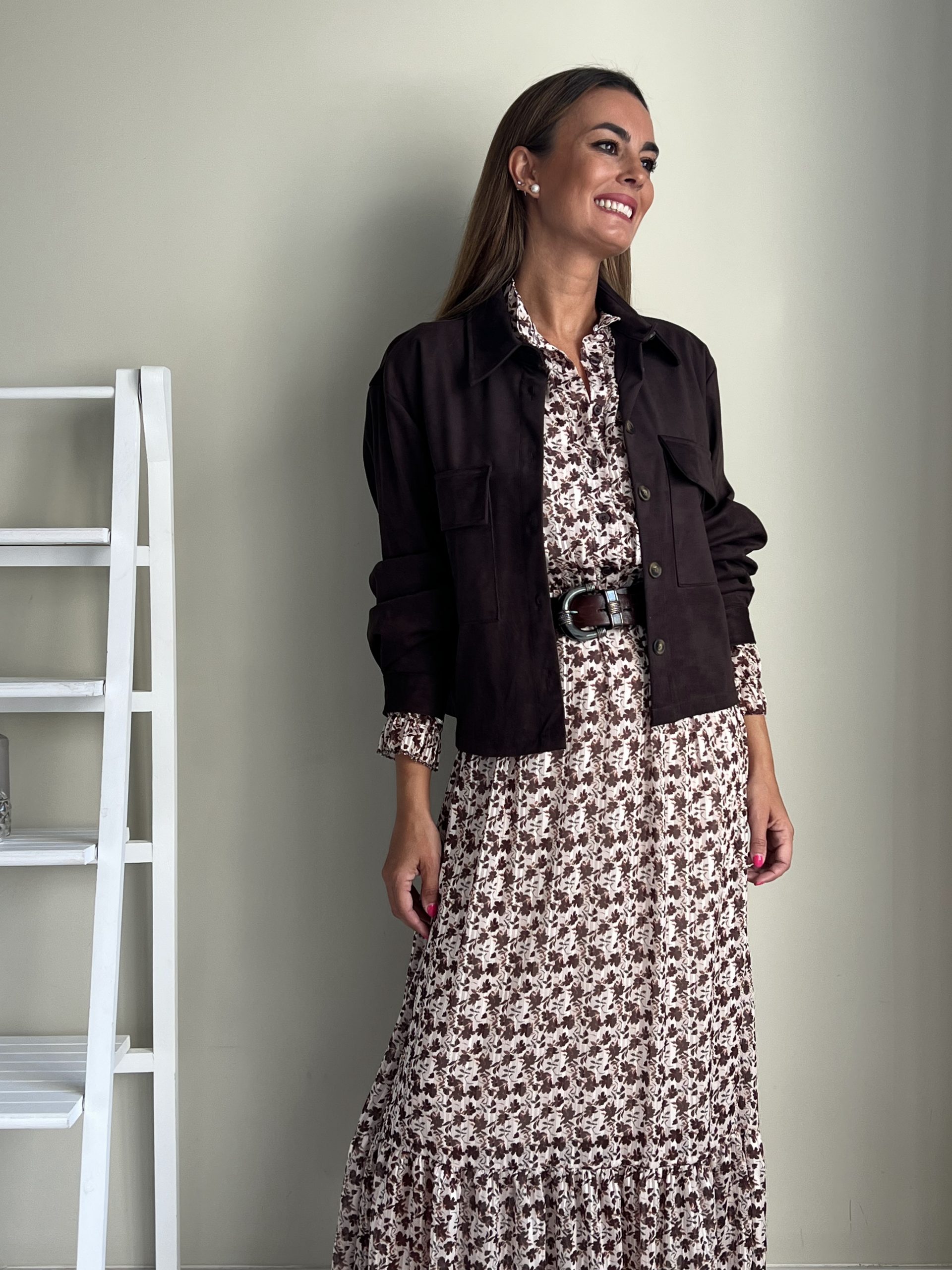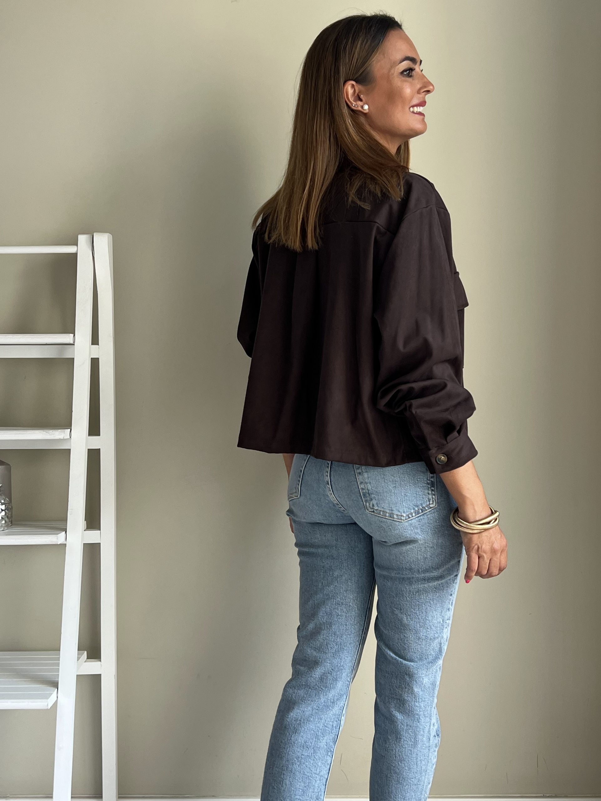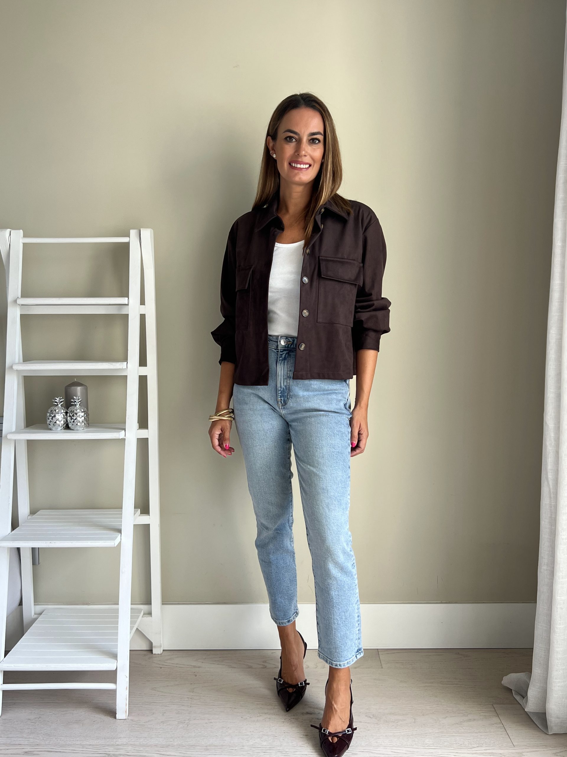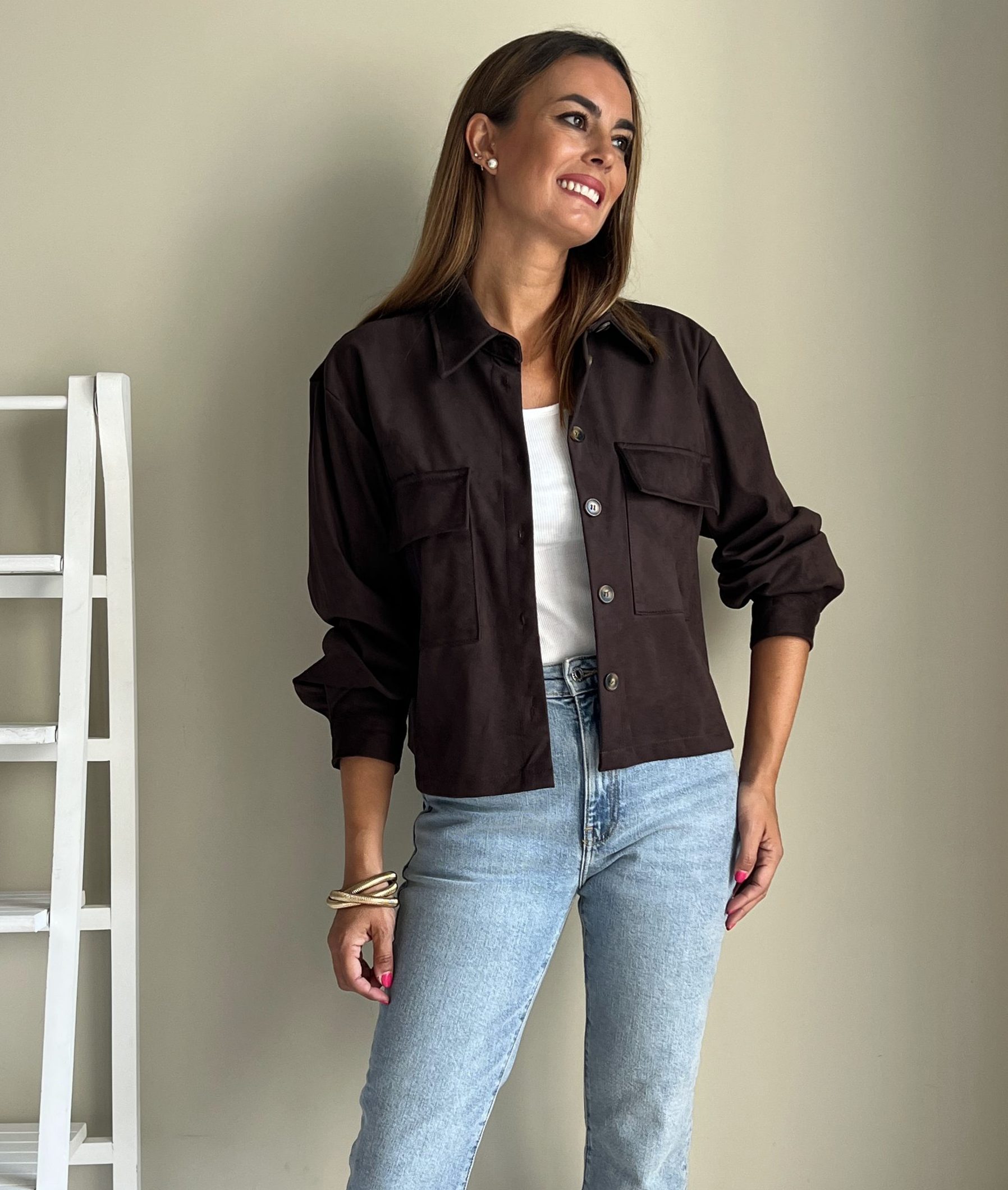 Chaqueta de efecto ante marrón chocolate con bolsillos centrales. Cierre con botonadura. Puños con botón.