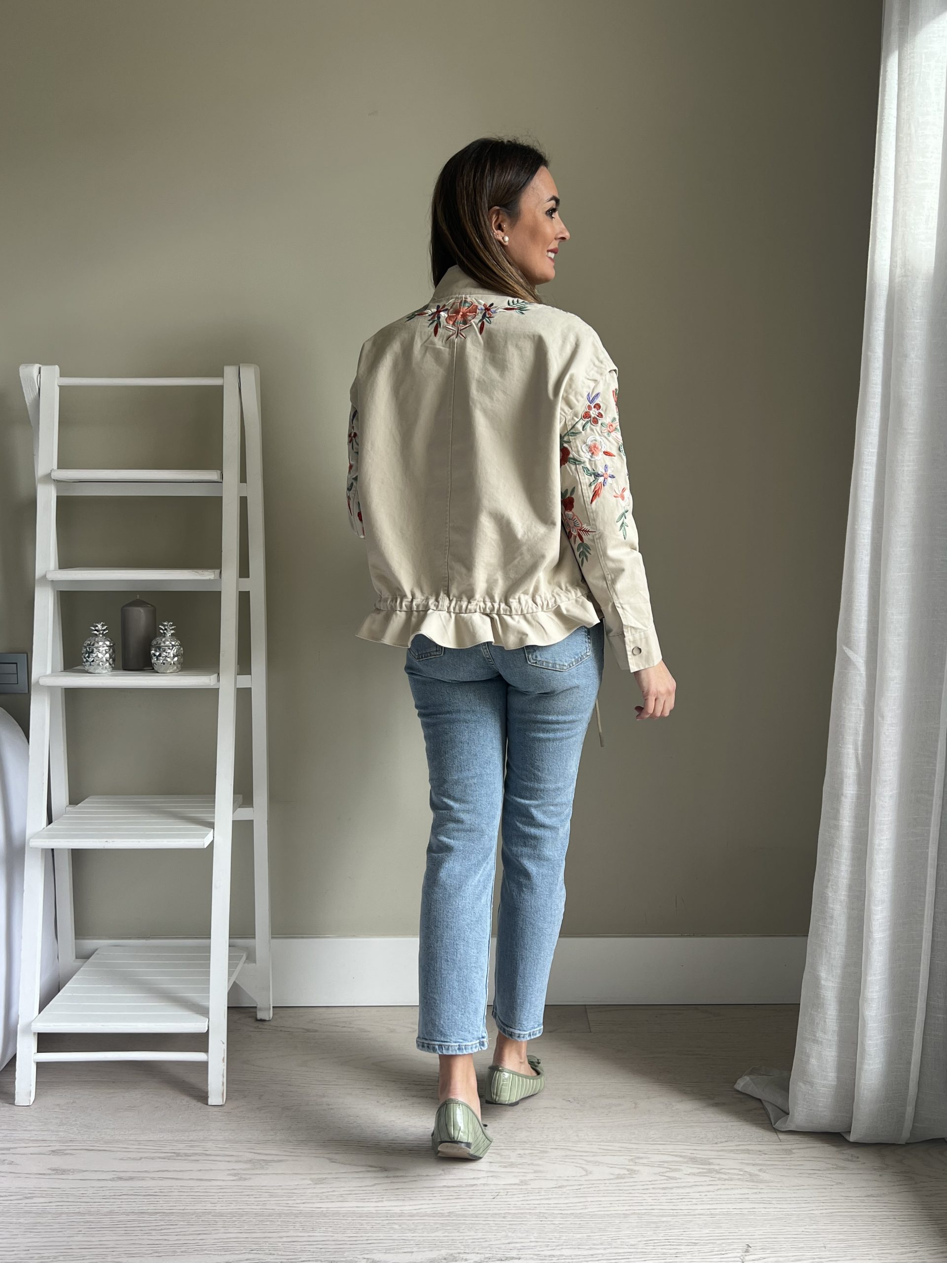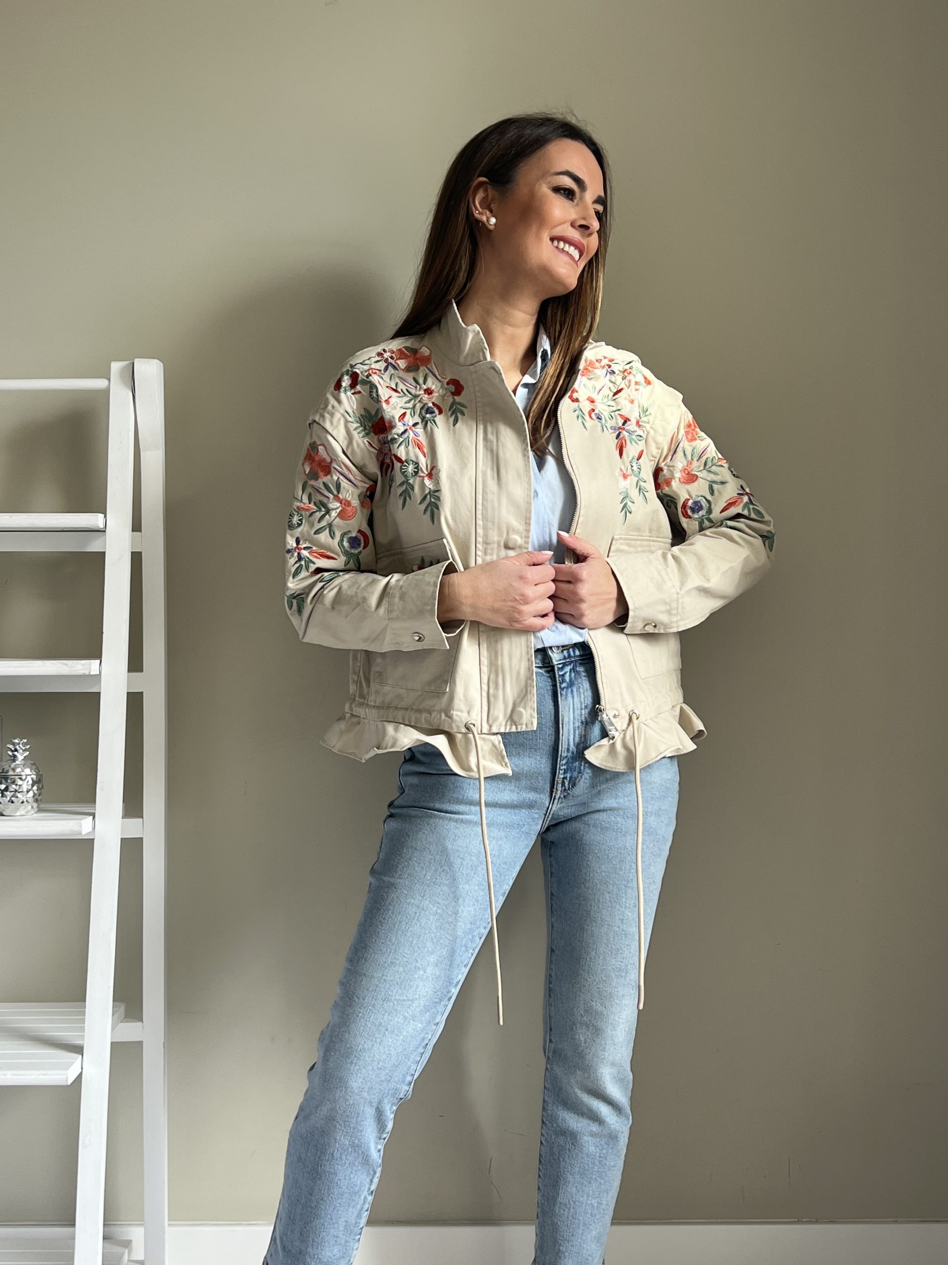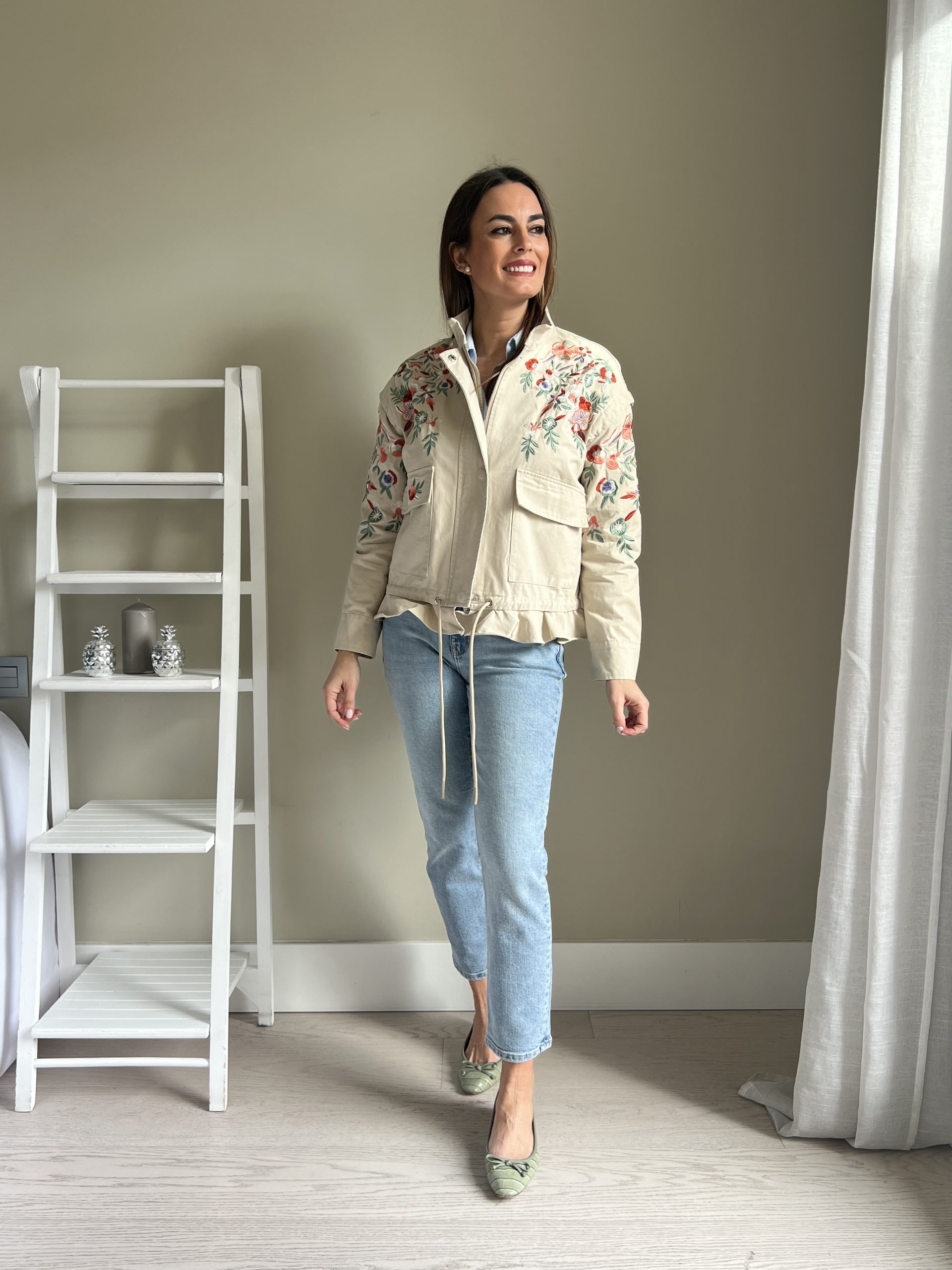 Chaqueta beige con bordados florales de colores. Bajo con volante y cordón ajustable. Bolsillos laterales. Cierre con cremallera y botones.