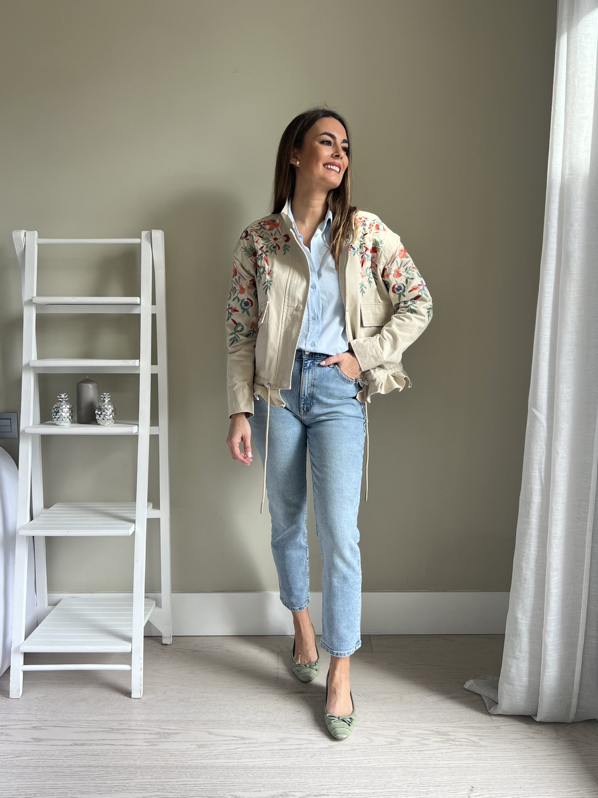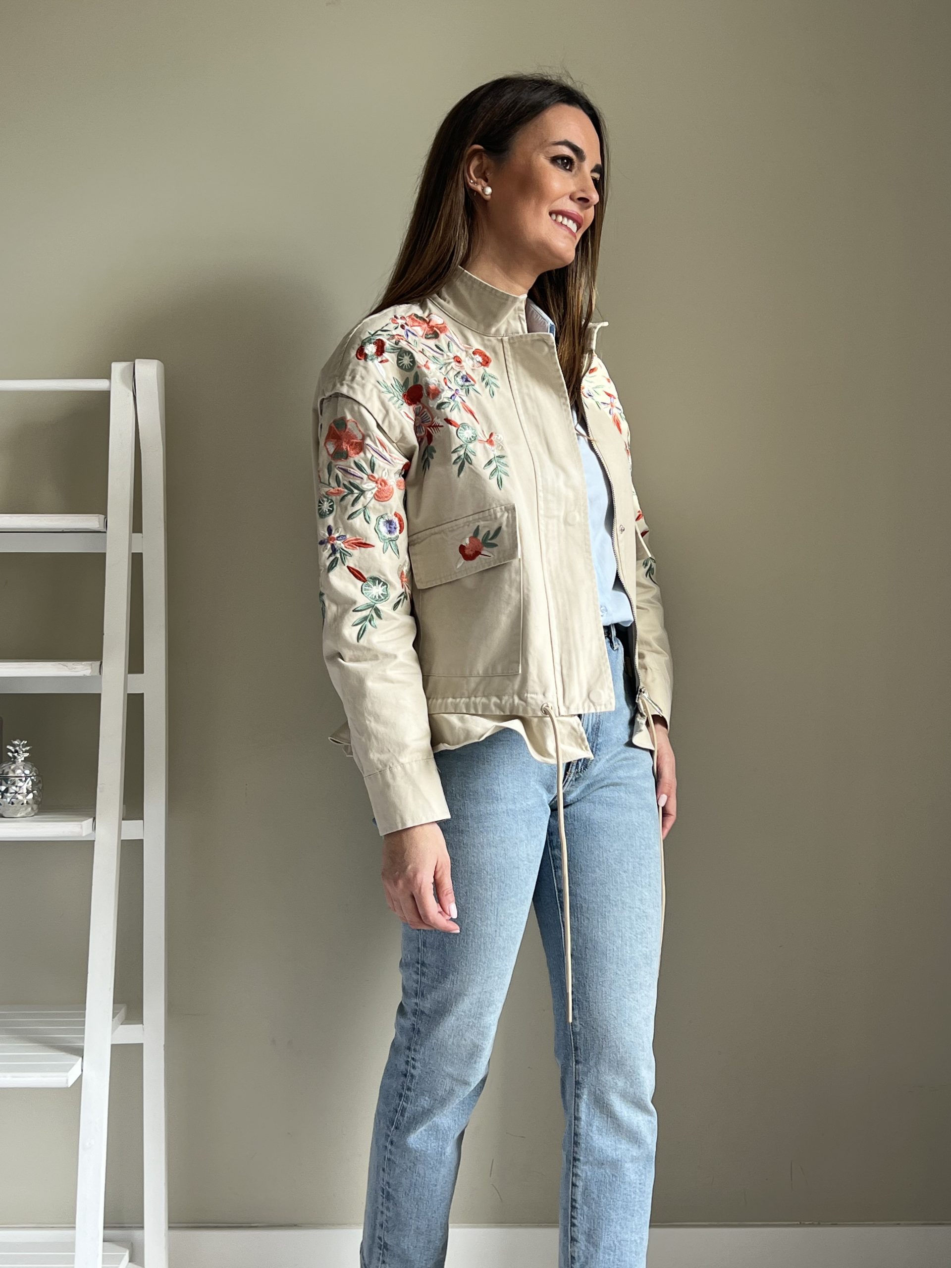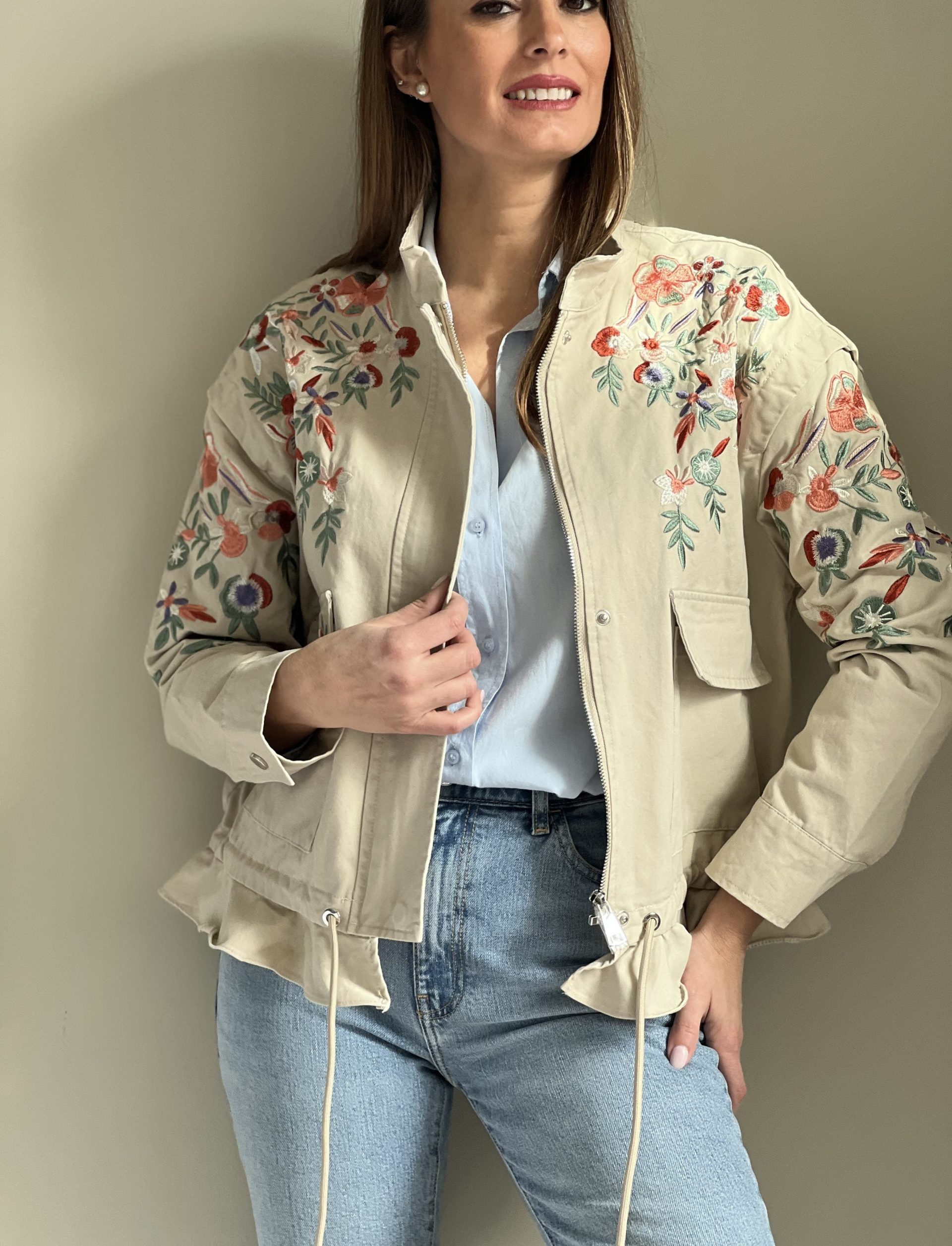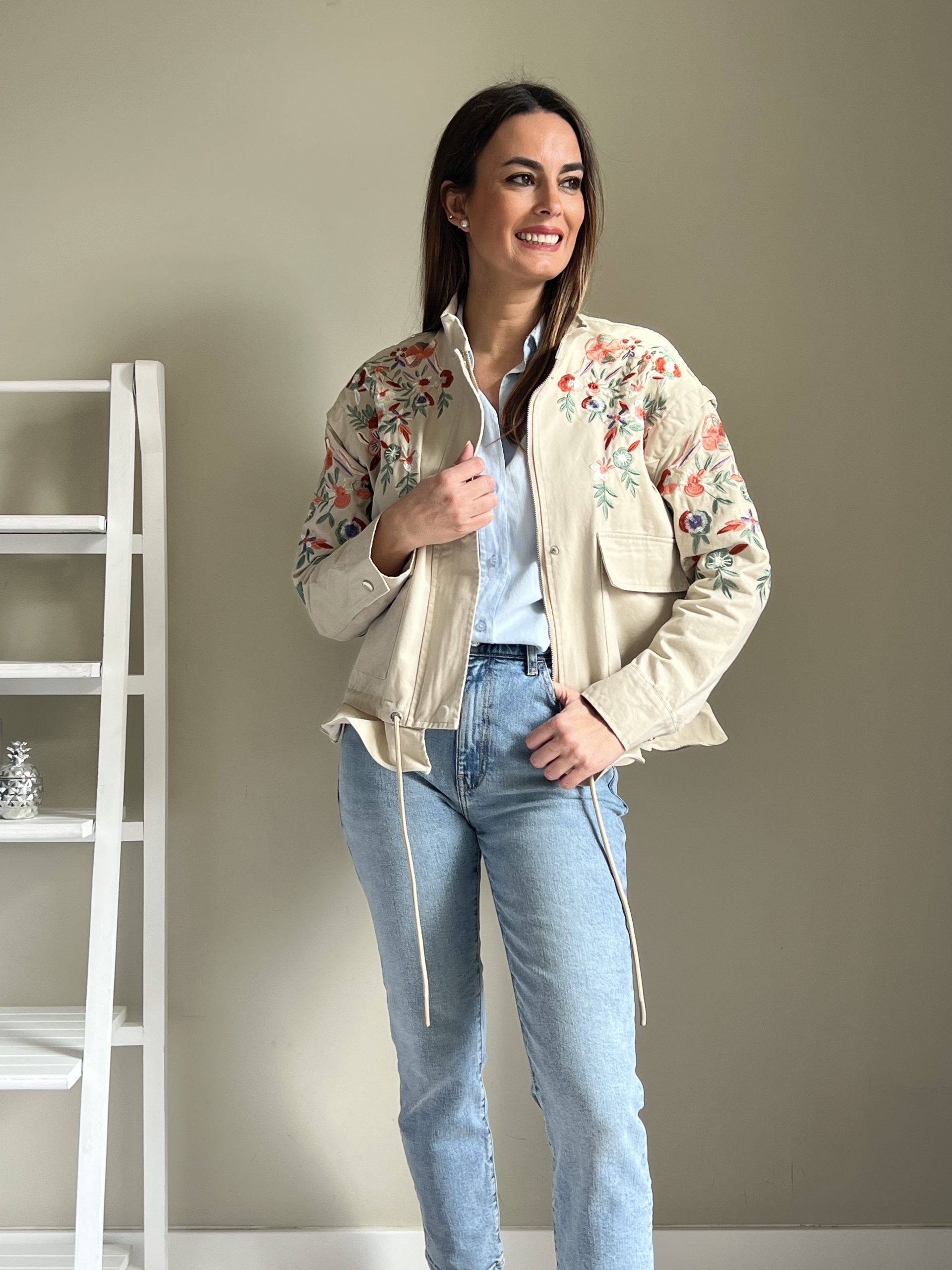 Chaqueta beige con bordados florales de colores. Bajo con volante y cordón ajustable. Bolsillos laterales. Cierre con cremallera y botones.