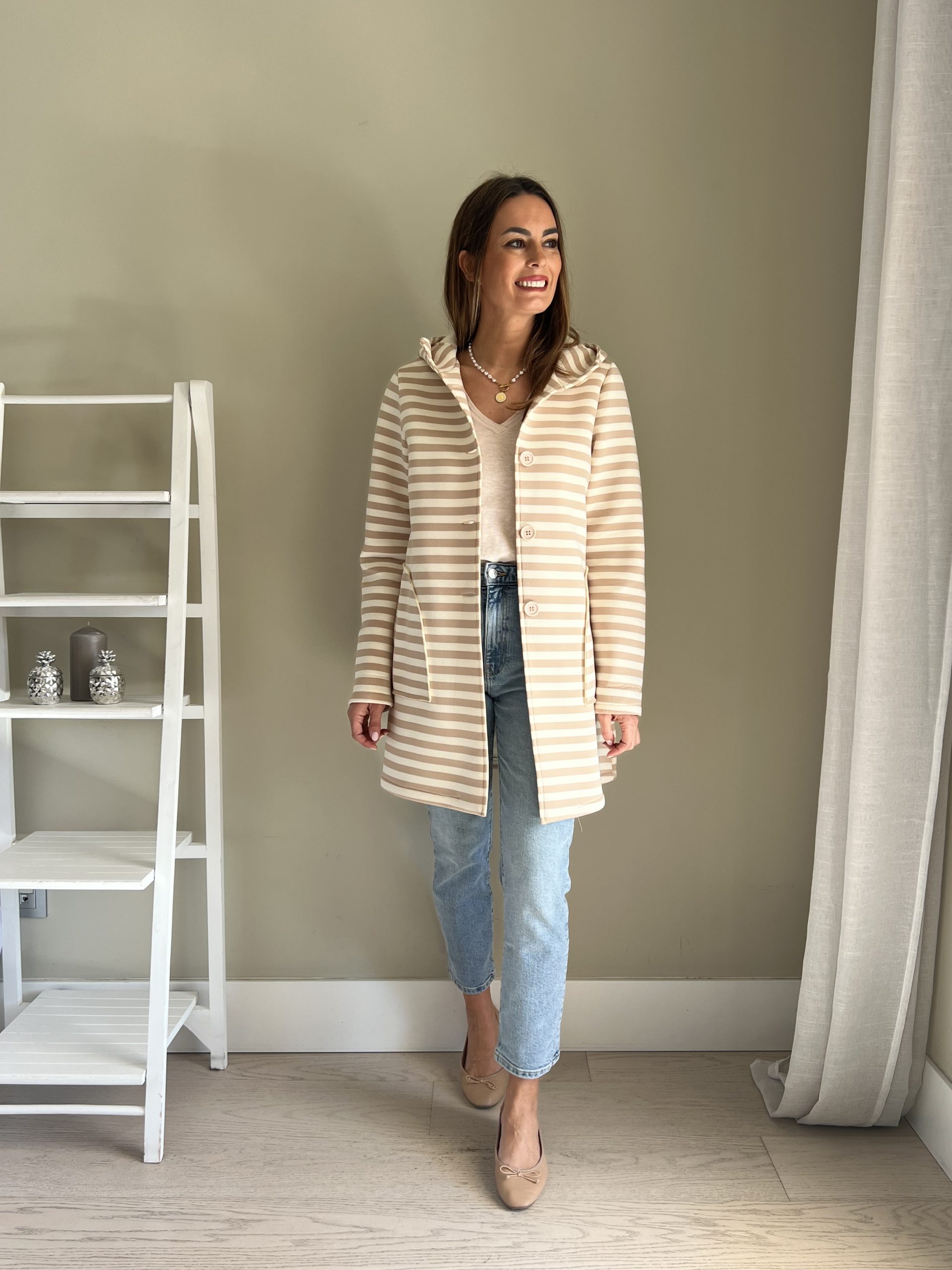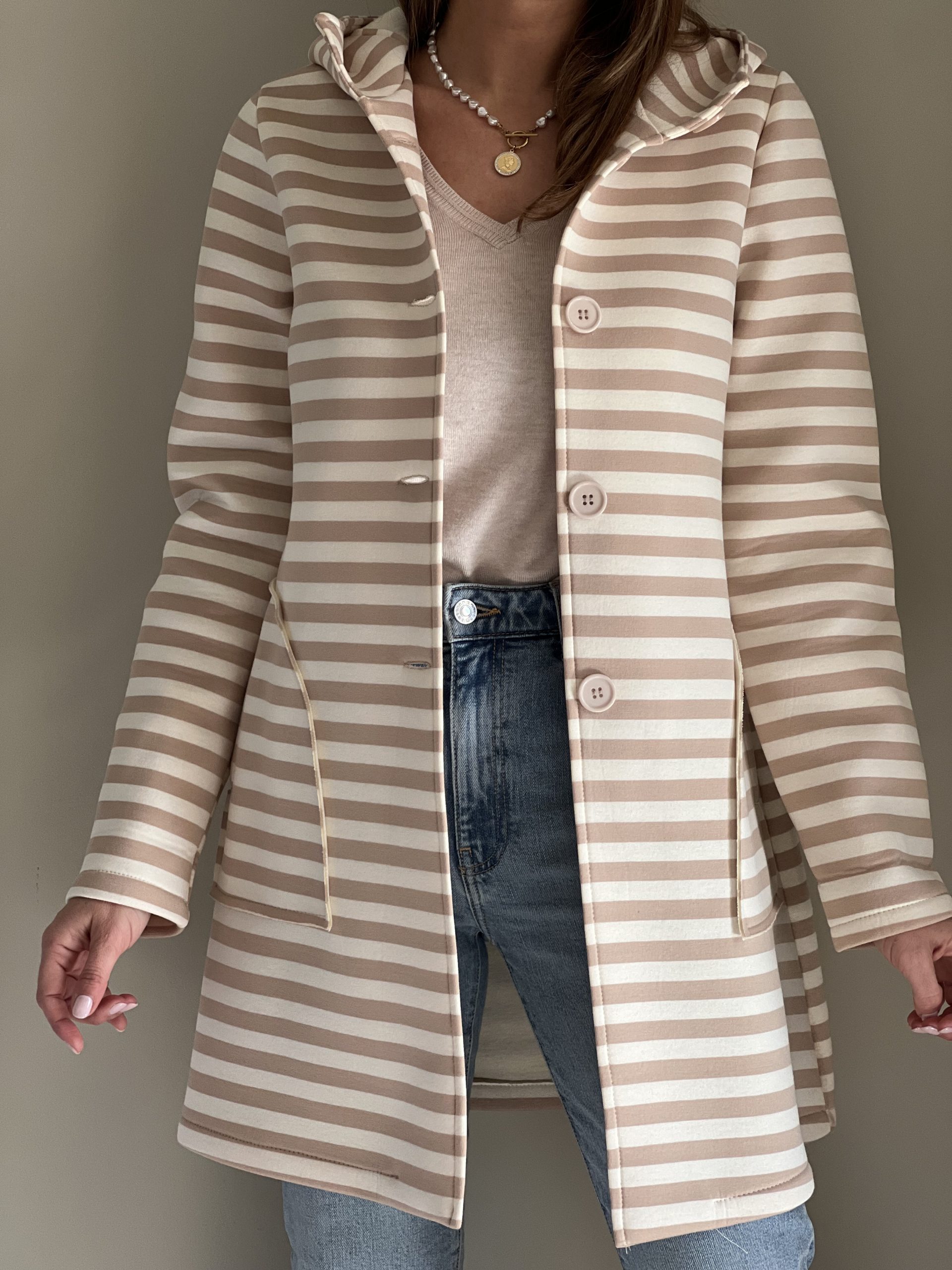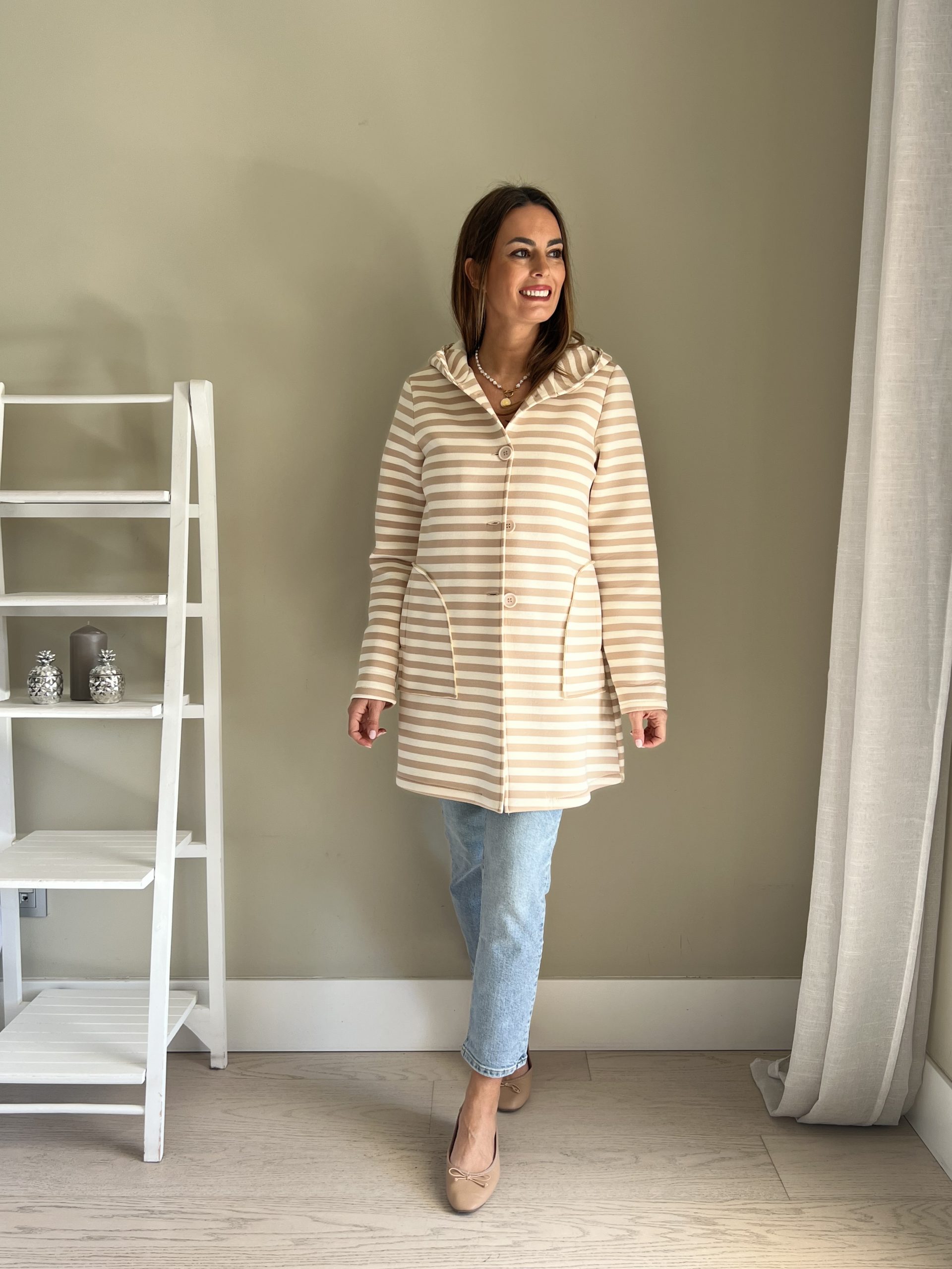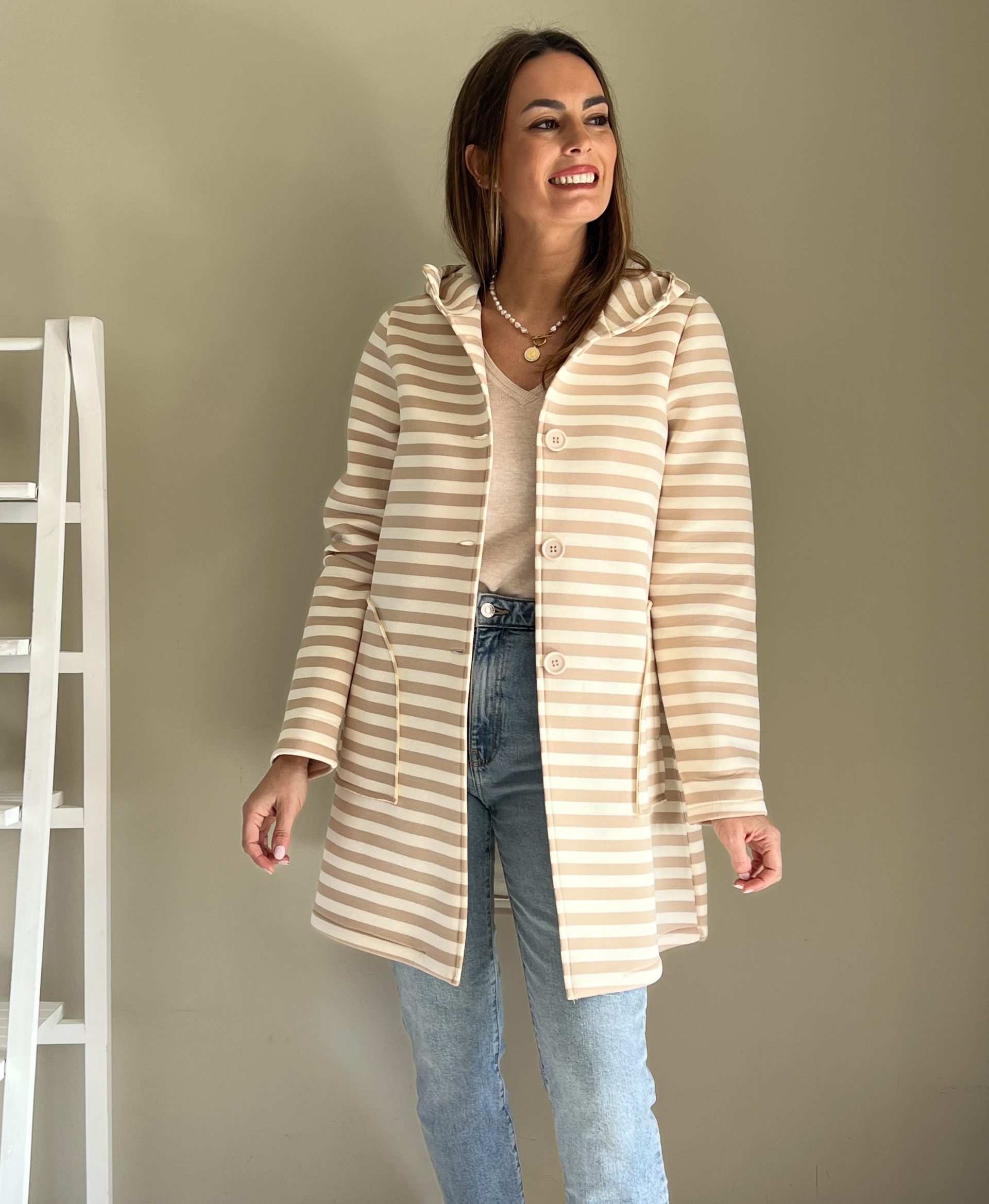 Chaqueta/abrigo con capuocha de rayas beige y blanco roto. Bolsillos laterales y cierre con botonadura central. Tejido tipo neopreno.