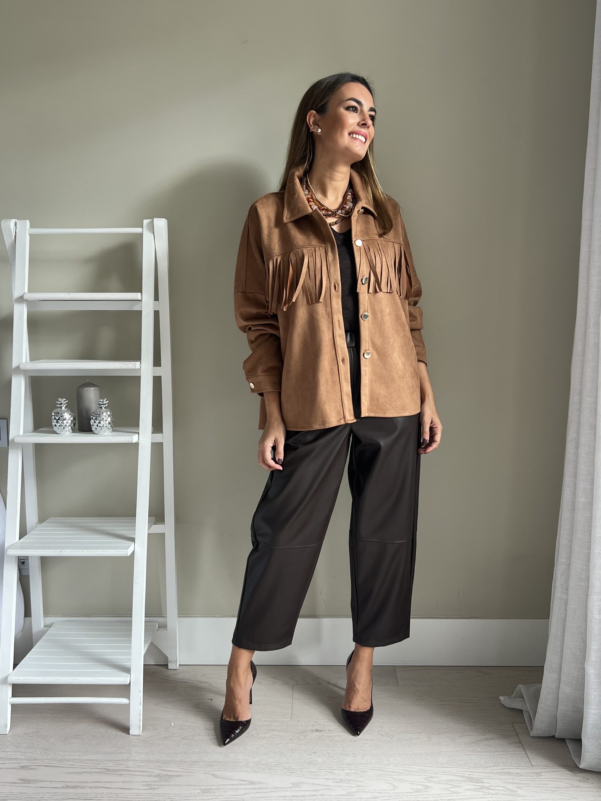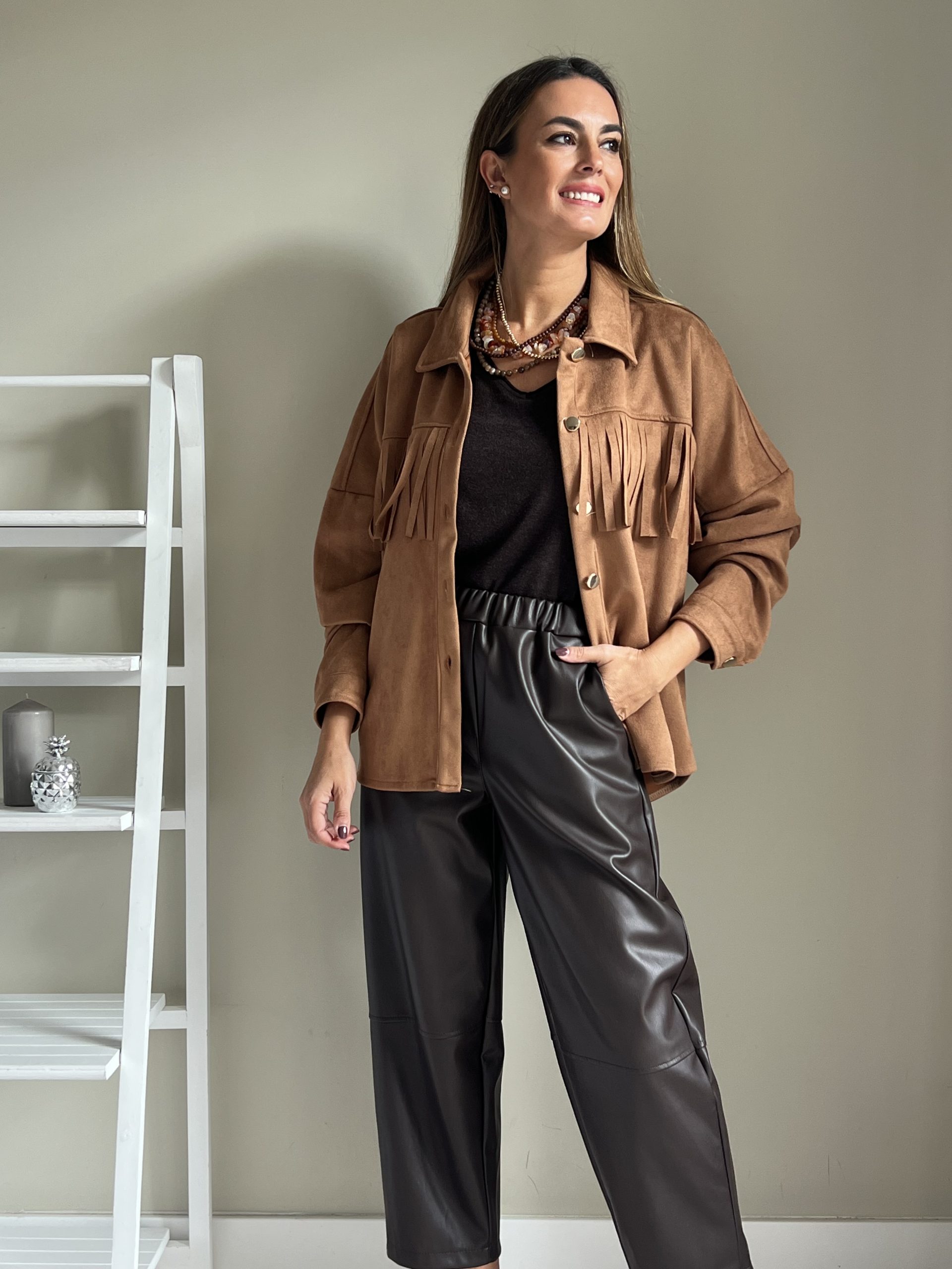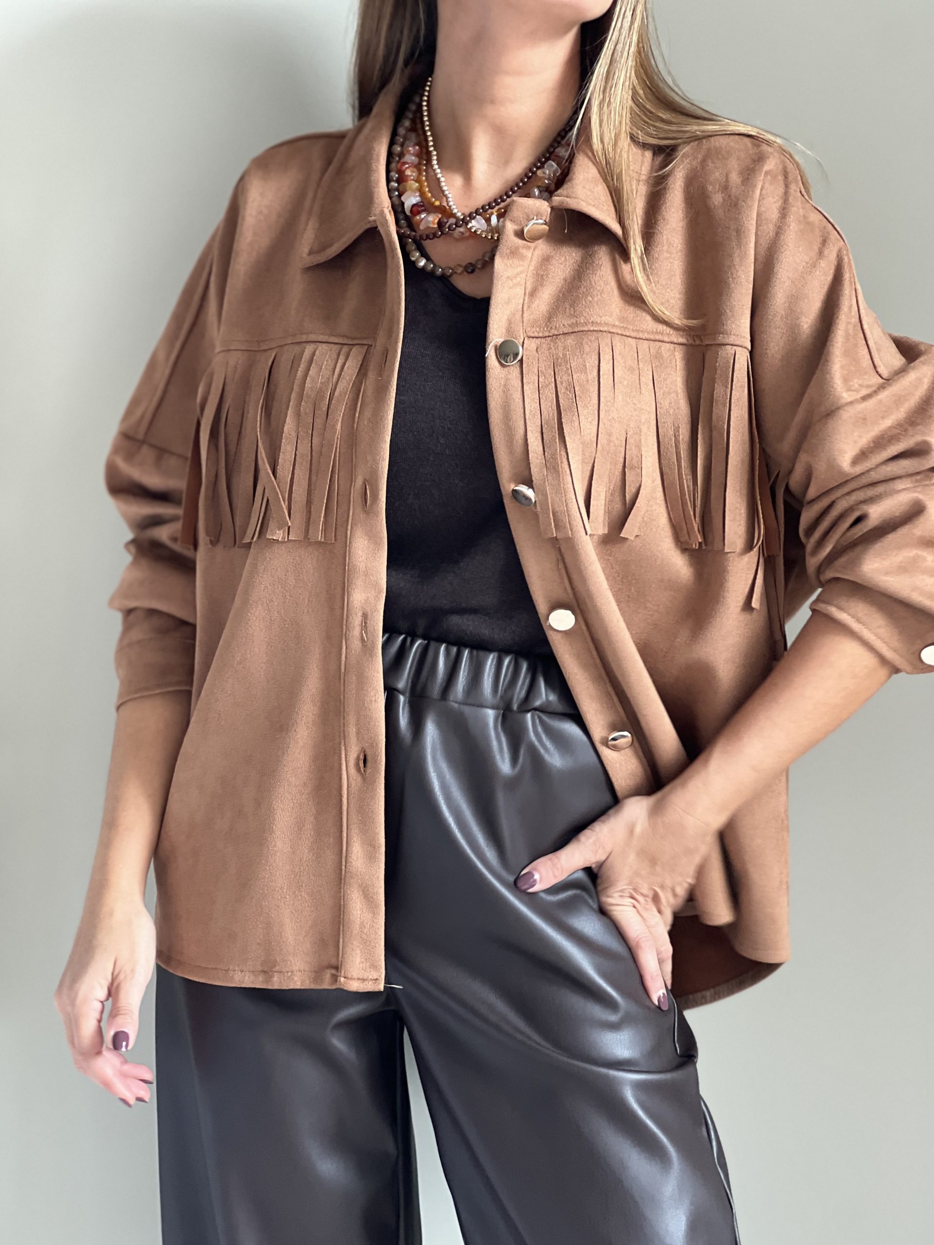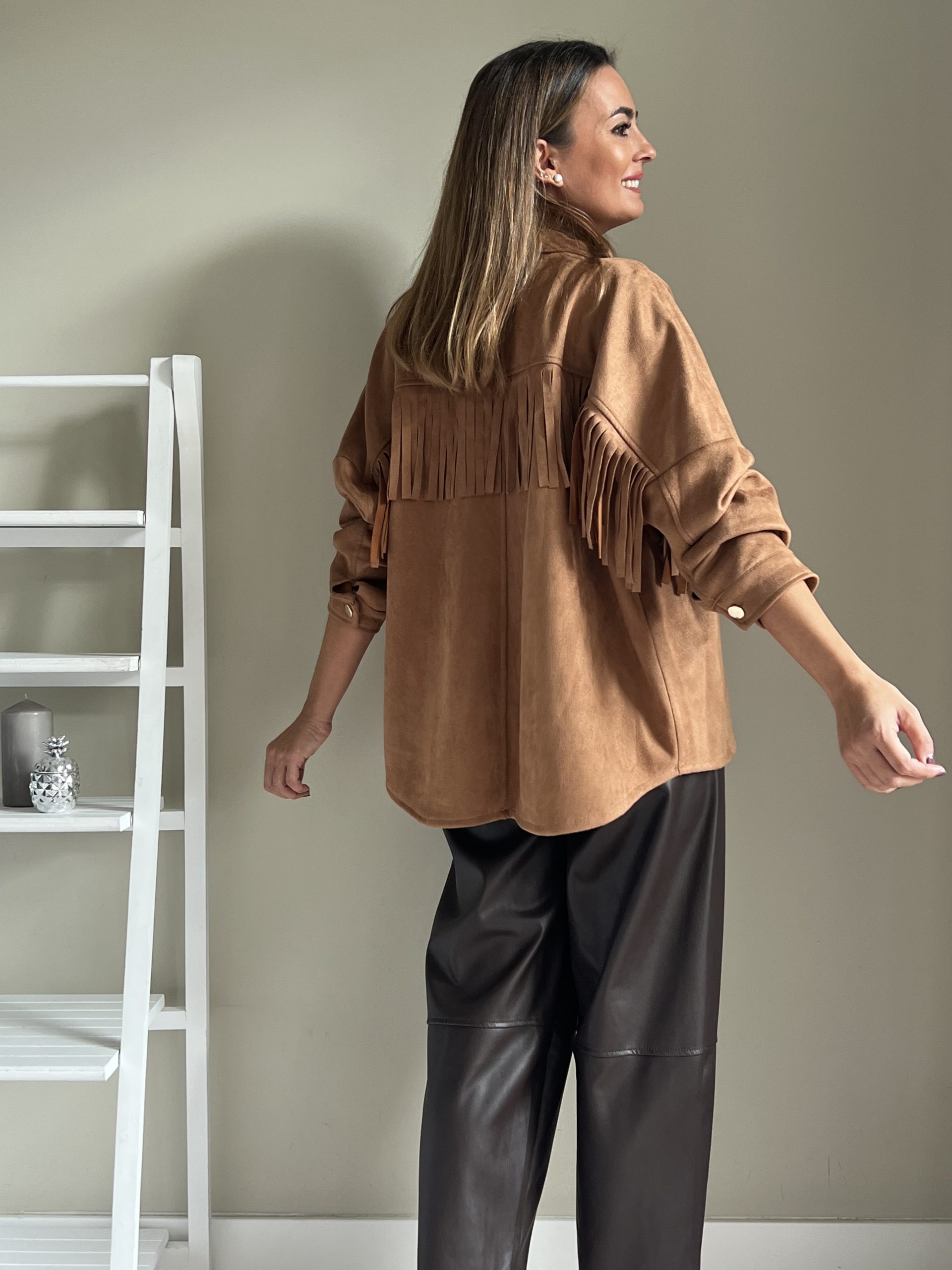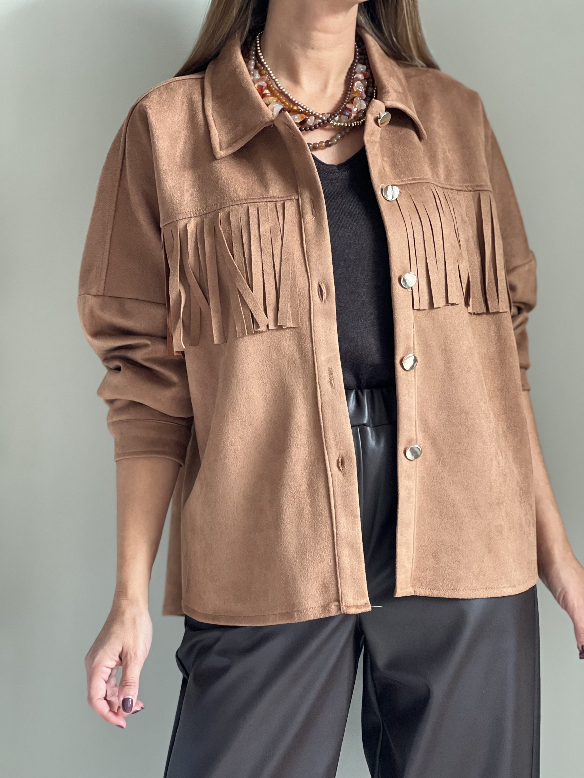 Chaqueta tipo sobrecamisa de efecto ante de color camel. Flecos por delante y por detrás y cierre con botonadura dorada.