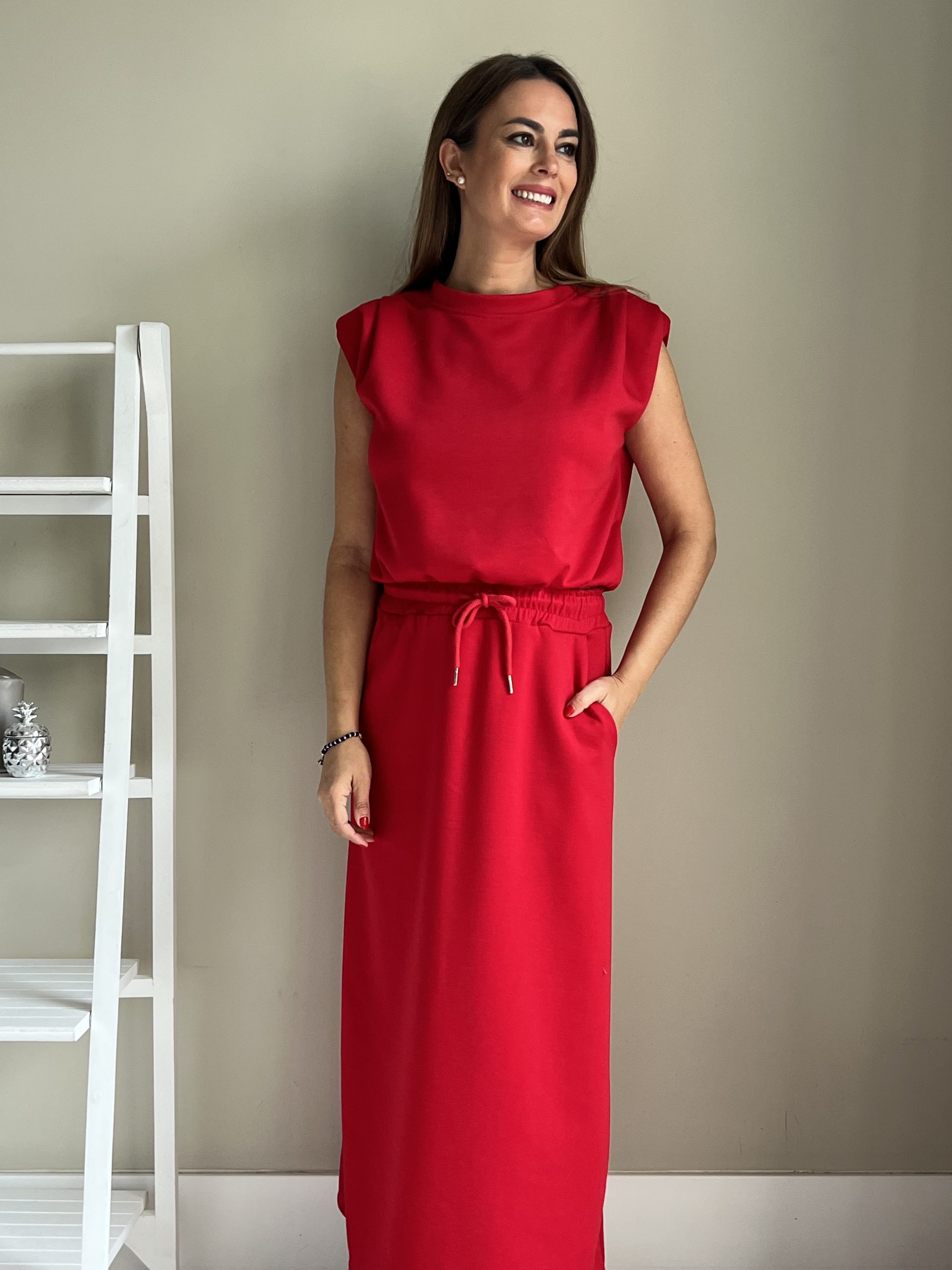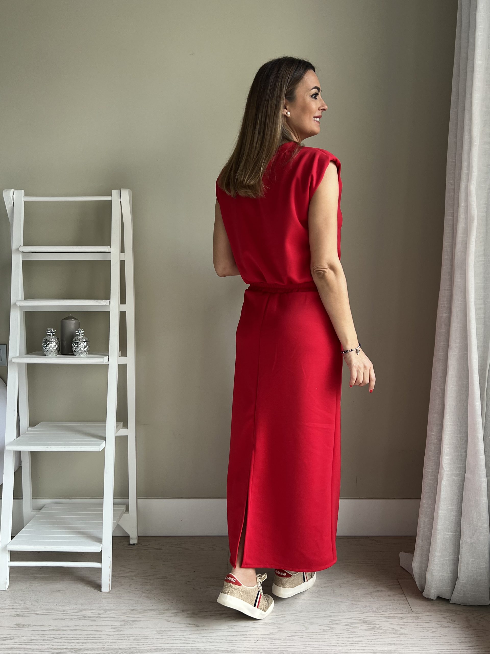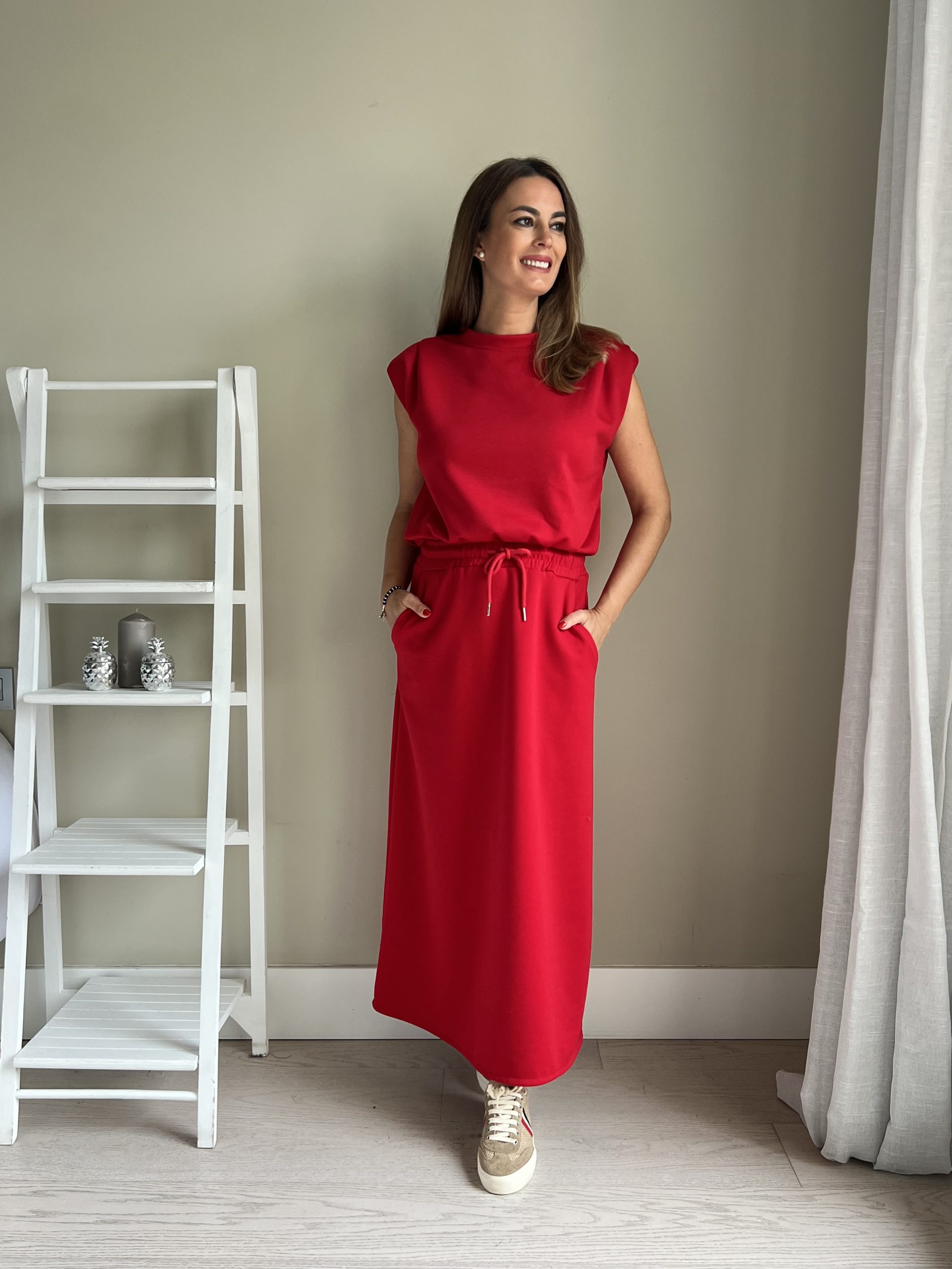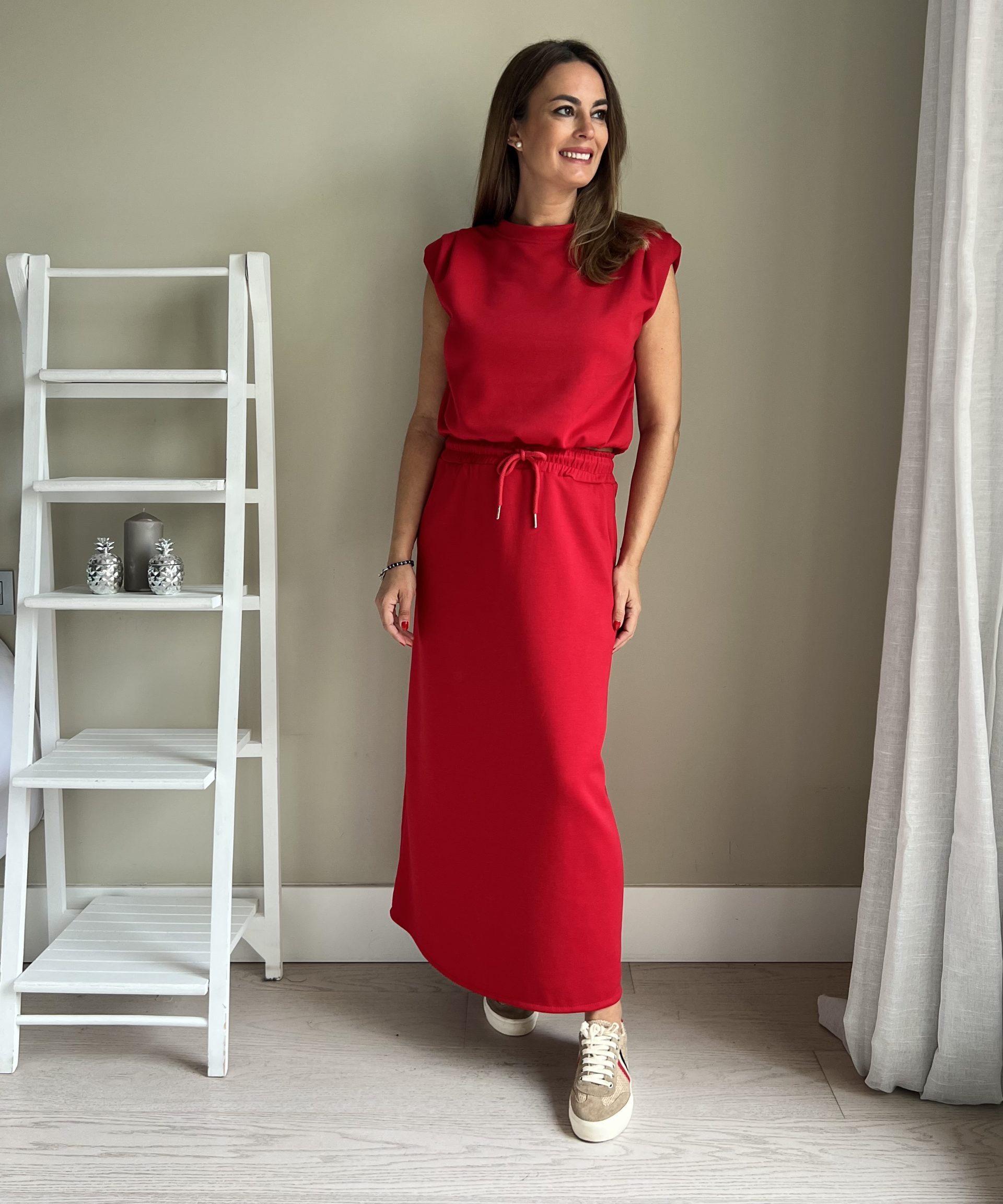 Conjunto casual rojo de falda larga con abertura trasera y cintura con cinta para ajustar. Top con hombreras y elástico en la parte de debajo.