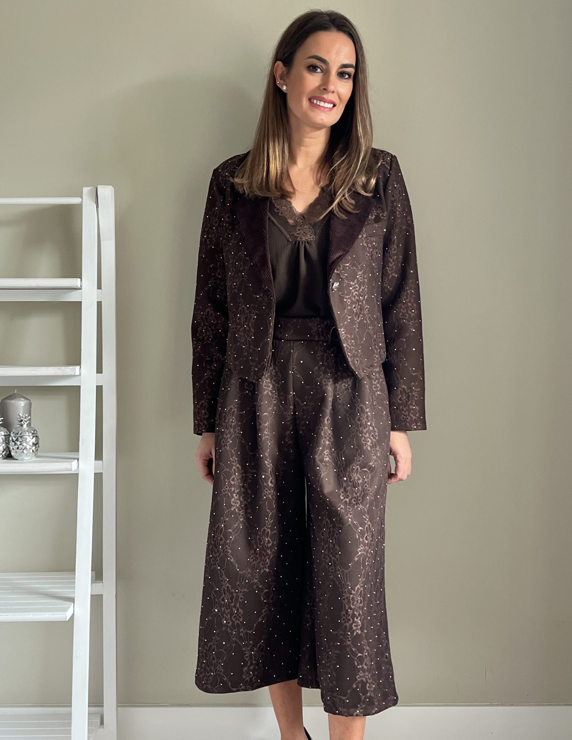 Conjunto marron chocolate brocado con flores en relieve y apliques plateados. Pantalón de pinzas con corte culotte con bolsillos laterales y cintura elástica. Chaqueta de corte a la cintura con hombreras y solapas de pana. Viene forrada. Incluye cinturón color camel.