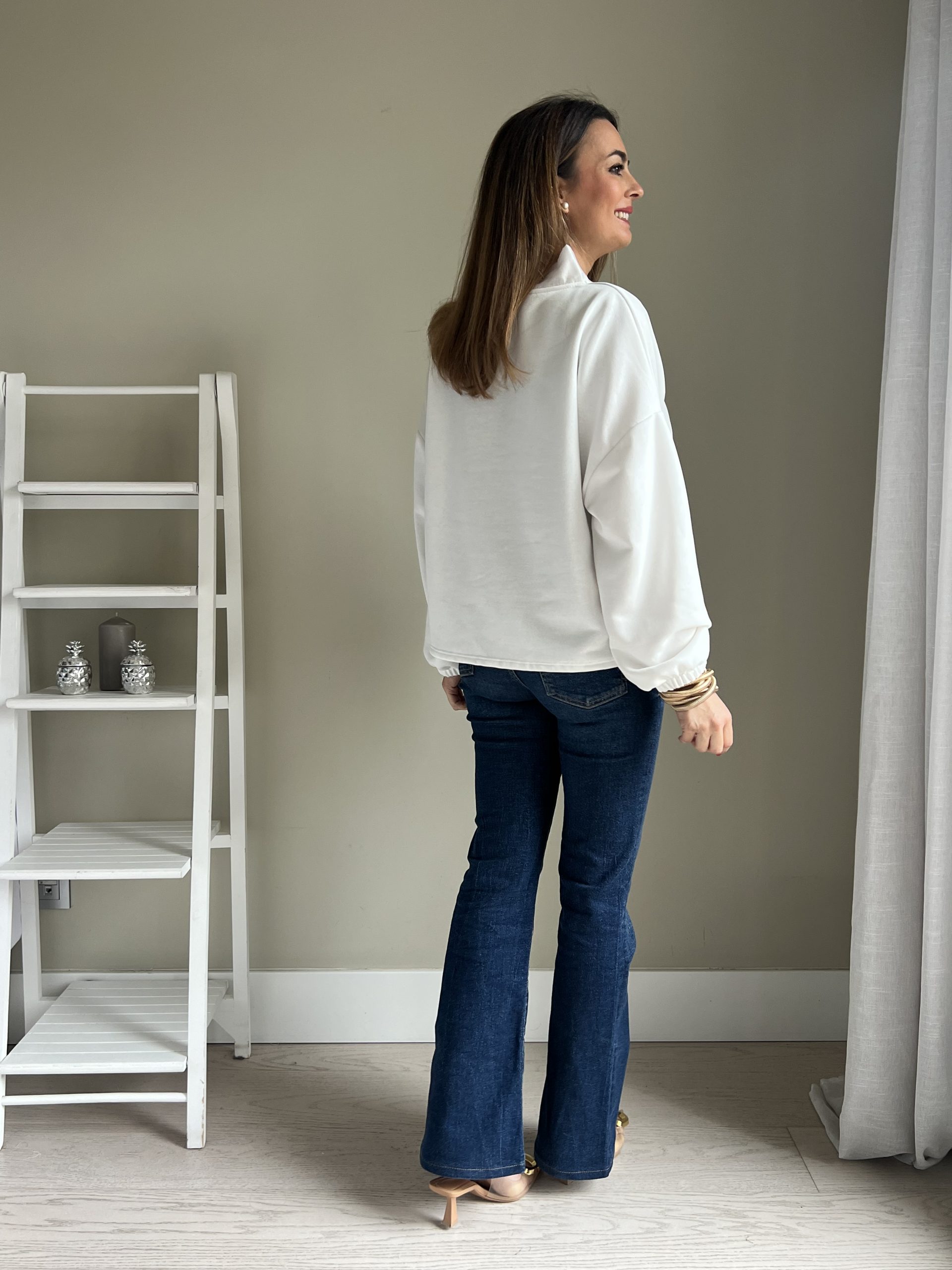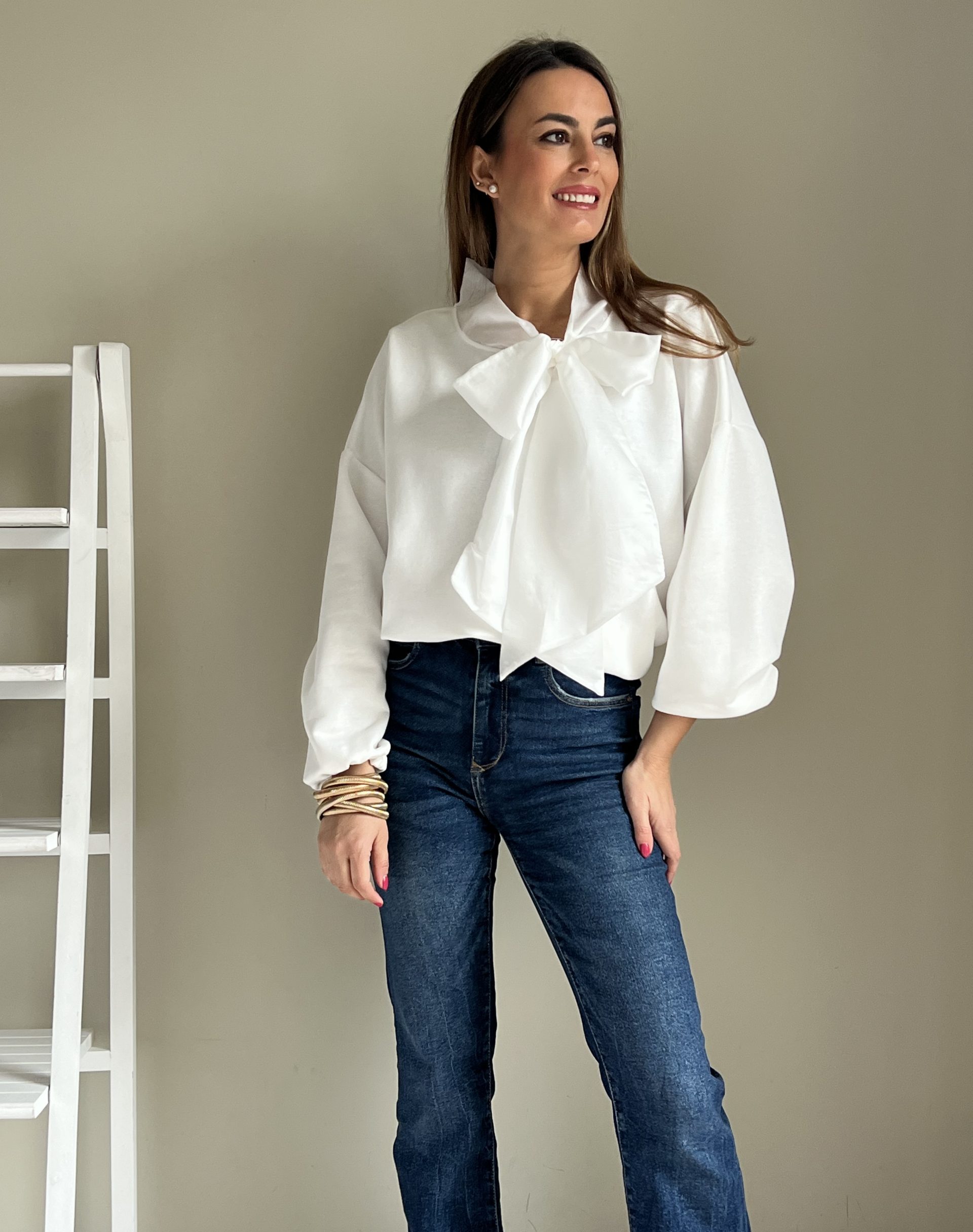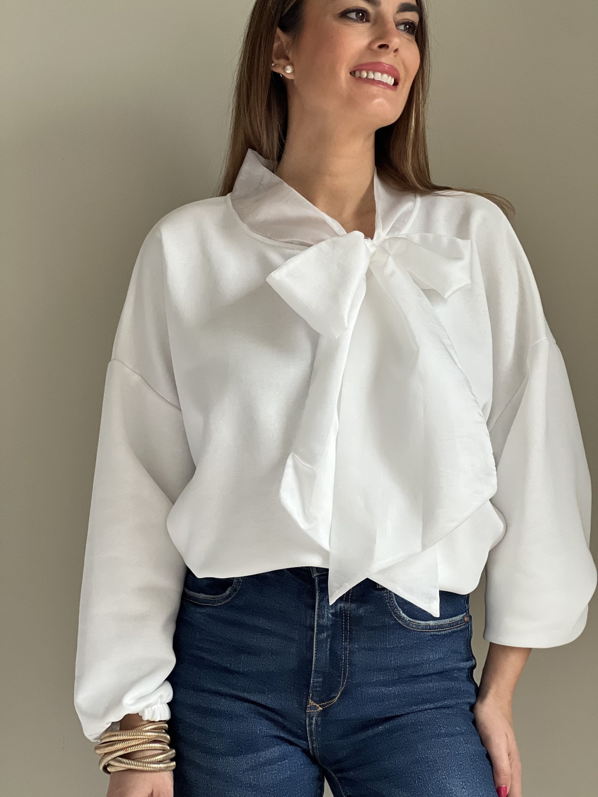 Jersey-sudadera de color blanco con lazada de distinto tejido.