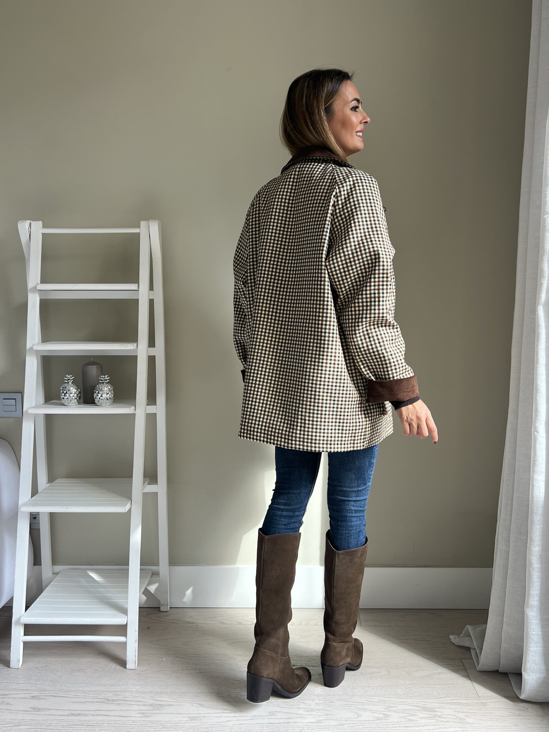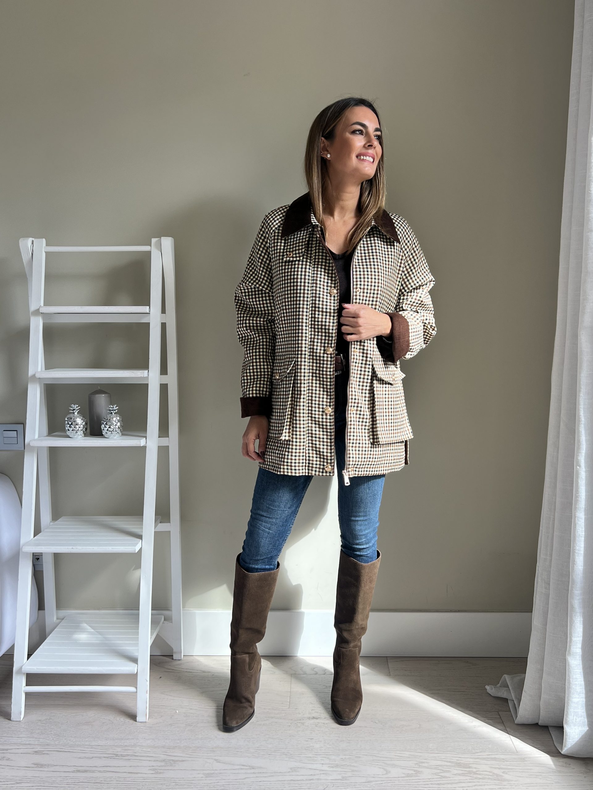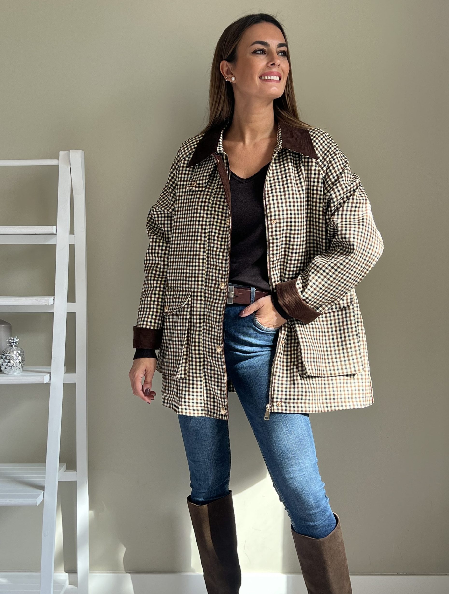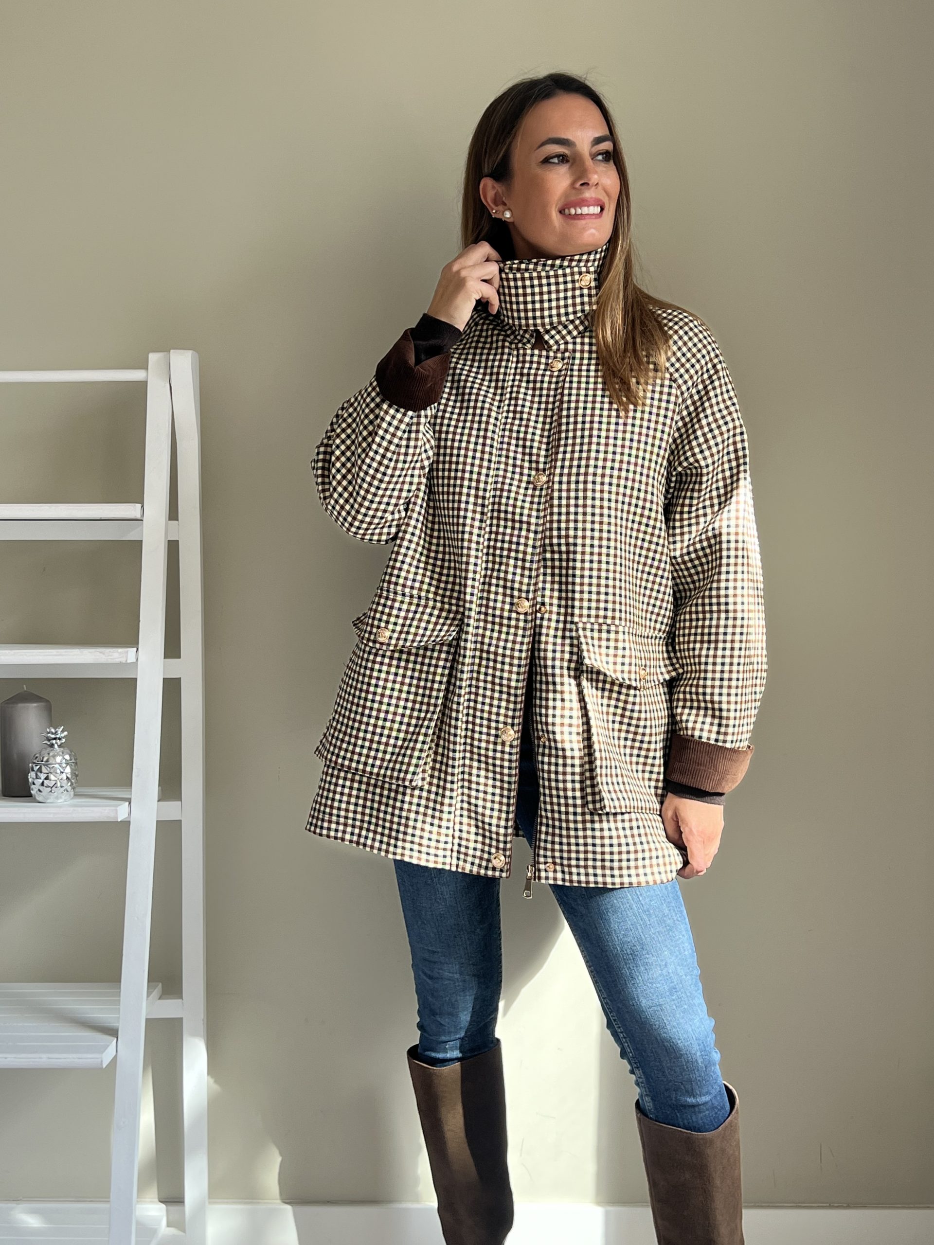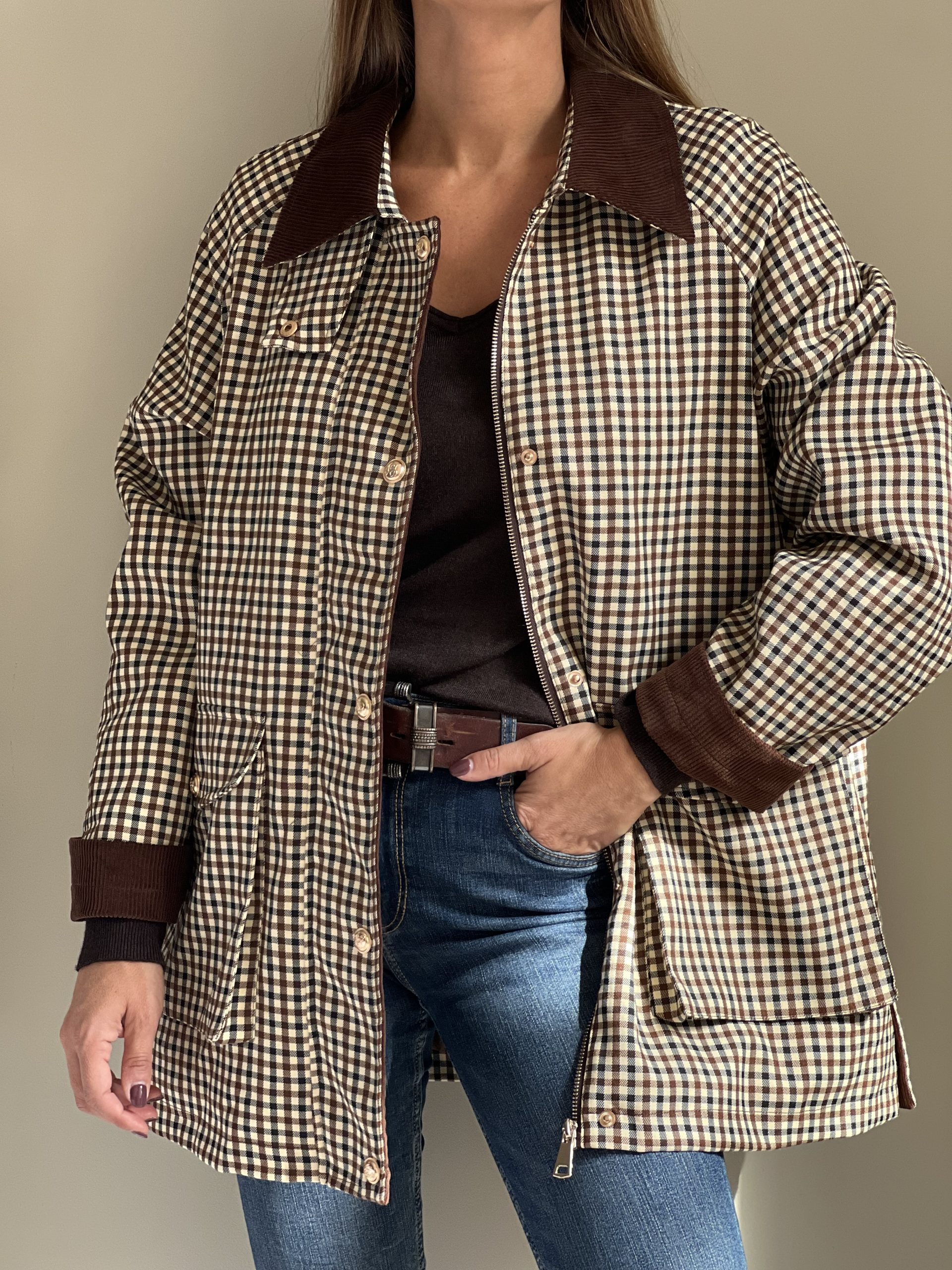 Parka de cuadros con estampado marrón chocolate y negro con fondo beige. Cuello, puños y tapeta de pana marrón. Bolsillos laterales con botones dorados. Cierre con cremallera dorada. Opción de cuello alto con cierre con botón. Forro acolchado marrón.