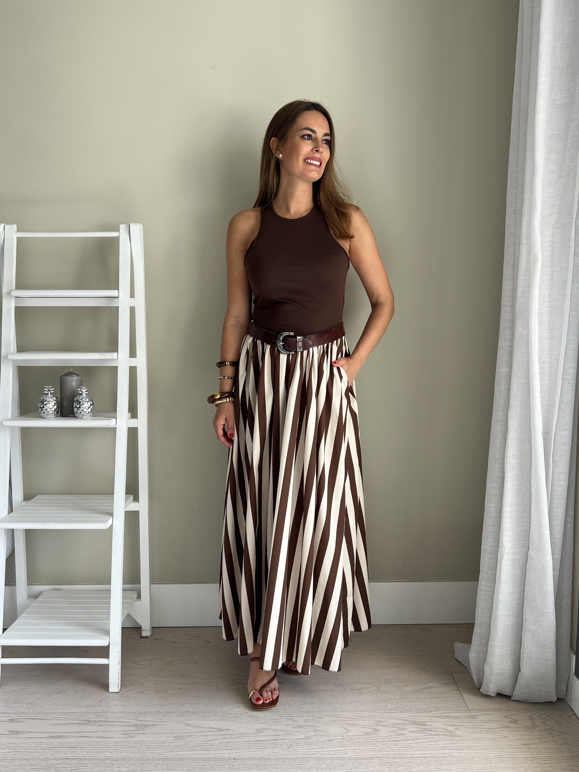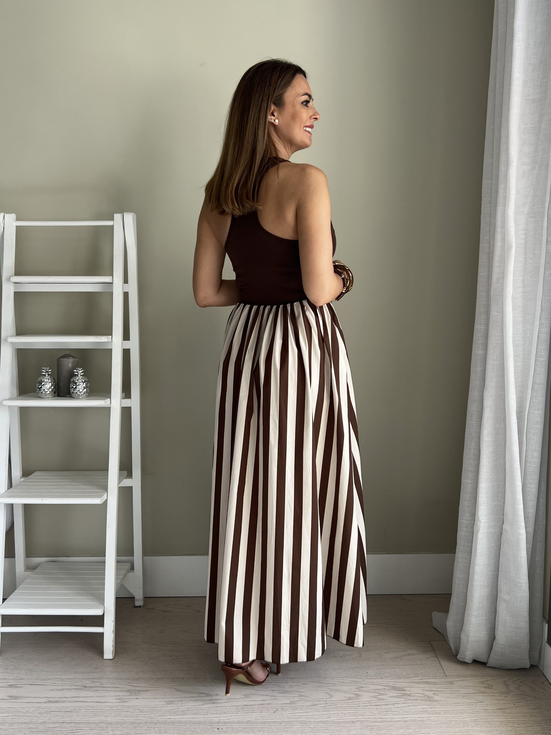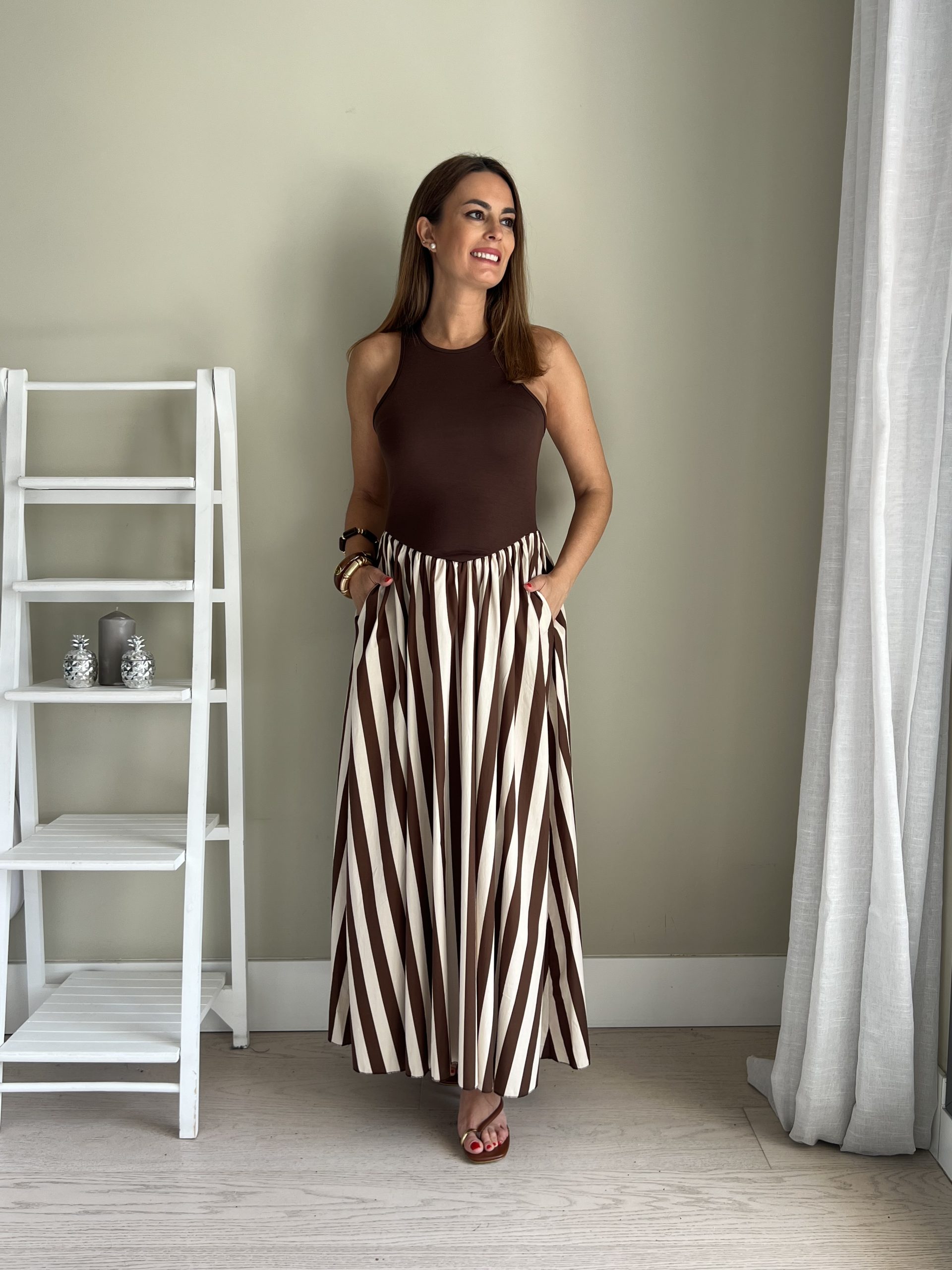 Vestido combinado de camiseta de tirantes marrón chocolate y falda de rayas blanca y marrón con bolsillos laterales.