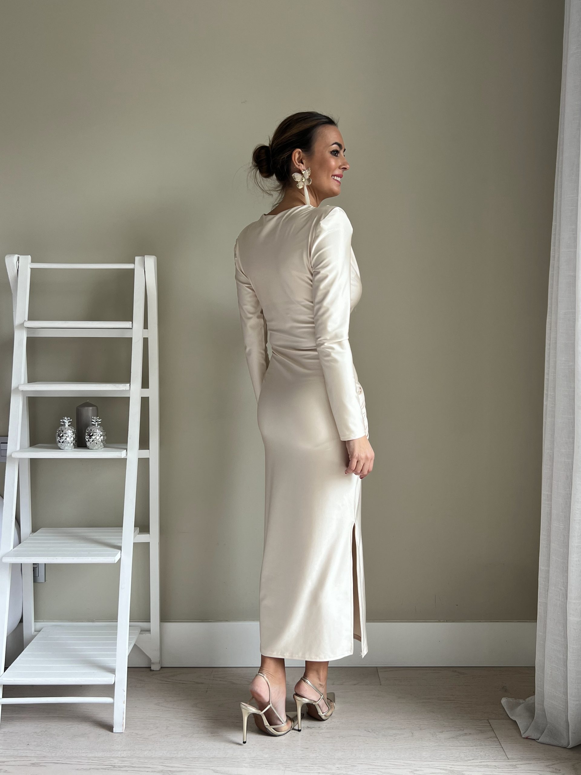 Vestido midi color champán de efecto satinado. Detalle drapeado en la cintura. Abertura en un lateral. Hombreras. Tejido elástico.