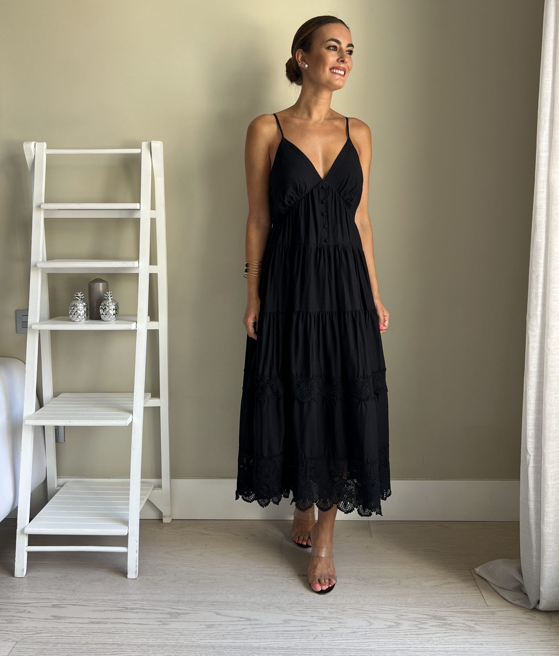 Vestido midi negro con detalles de guipur en los volantes del bajo. Espalda cruzada con tirantes regulables. Escote de pico con botones a modo detalle. Viene con forro.